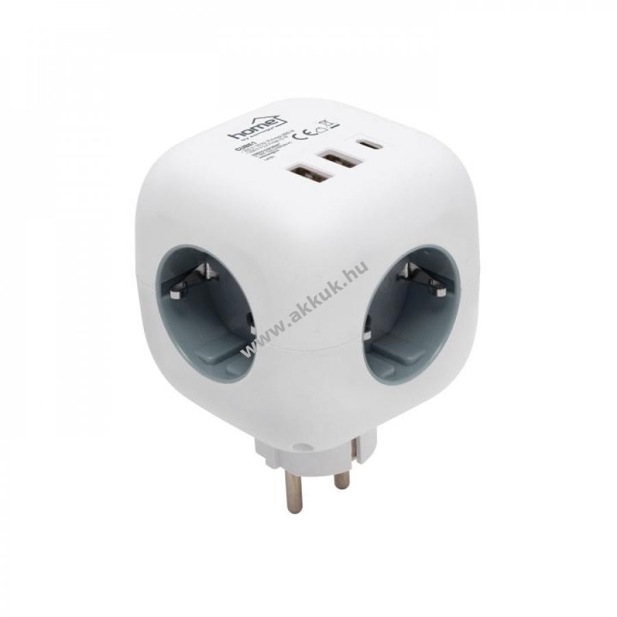 1db USB-C, 2db USB-A töltőaljzatokkal, védőföldelés van, világító főkapcsoló, gyerekvédelem