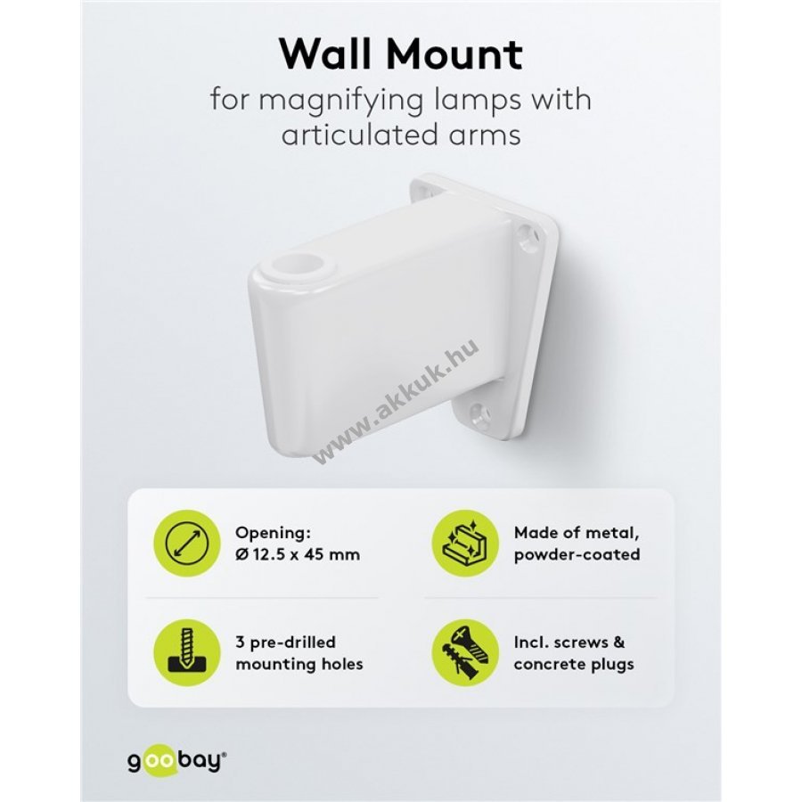 Alternatív rögzítő megoldás nagyító lámpákhoz ízületes karral fali vagy íróasztali rögzítéshez. 12 mm átmérőjű tüskével rendelkező lámpákhoz alkalmas. 12,5 mm átmérőjű és 45 mm hosszú nyílással. Mikrofonkarok és mikrofonállványok tartójaként is használható. Kompatibilis a Goobay nagyító lámpák 60360 60361 60362 60364 modellekkel. Három előre fúrt 4,2 mm átmérőjű rögzítőfurattal rendelkezik. Méretei 84 x 52 x 65 mm (hosszúság x szélesség x magasság). A csomag tartalmaz 3 db keresztfejű csavart és 3 db fali tiplit a falra szereléshez.