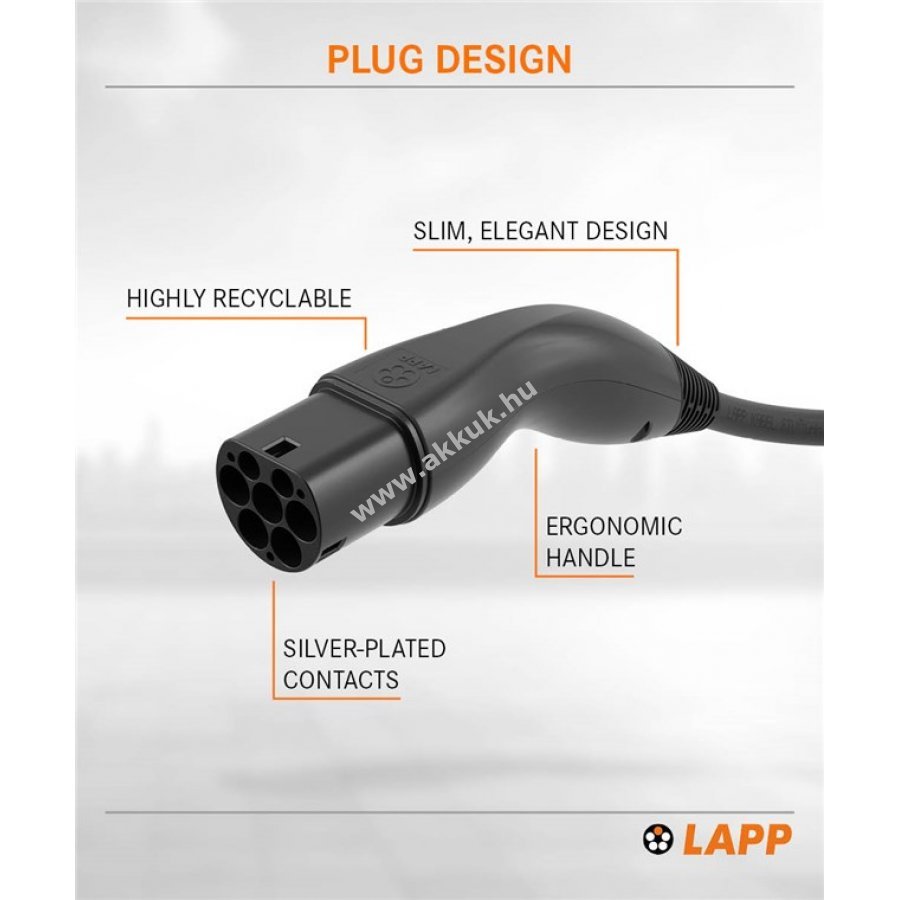 A LAPP type 2 töltőkábele lehetővé teszi az egyszerű és gyors, akár 11 kW-os töltést nyilvános vagy privát töltőállomáson vagy fali dobozon. Szabadalmaztatott, önbehúzó kábel alakmemóriával, amely használat után spirál alakban feltekeredik, és gyorsan eltárolható.A méretstabil kialakítás megakadályozza az EV töltőkábel összegabalyodását A rendkívül robusztus, járműálló kábelek és dugók ezüstözött érintkezőkkel extra tartósságot biztosítanak Olajálló és hosszirányú vízzáró EV töltőkábel magas nedvességvédelemmel az IP55 szabvány szerint, üzemi hőmérséklet -40 °C és 50 °C között. A Type 2 to Type 2 EV töltőkábel helytakarékos és könnyű kezelhetőségű a kis súlyának köszönhetően. Az aktuális IEC és EN szabványok szerint gyártott 3. üzemmódú töltőkábel, amely kompatibilis az európai járművekkel és töltőállomásokkal, valamint a CCS-csatlakozásokkal (Combo 2)