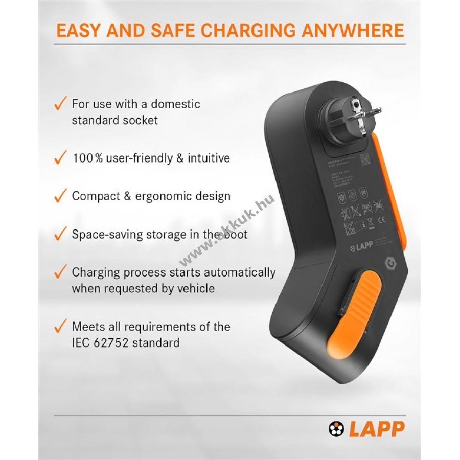 A LAPP töltő lehetővé teszi az egyszerű, mobil töltést a szabványos háztartási aljzatokon keresztül (CEE 7/3 védőkontaktus, E/F típusú dugó), és ideális utazáskor vagy az otthoni garázsban. A Mode 3 töltőkábelek töltőállomása a 255 mm x 135 mm x 105 mm-es kompakt kialakításának köszönhetően helytakarékosan elfér a csomagtartóban. Az EV vészhelyzeti töltő olajálló és legfeljebb 2,3 kW töltési teljesítményt támogat 230 V névleges feszültségen, üzemi hőmérséklet -25 °C és 45 °C között. Az integrált kioldókar egyetlen csuklómozdulattal kioldja a csatlakoztatott Type 2 töltőkábelt a töltés után. A falhoz támasztáshoz kihajtható nyomatéktámasz csökkenti a dokkoló súlyát és a csatlakoztatott konnektorra helyezett kábel súlyát. Praktikus LED-es teljesítményjelzővel ellátott a házban Különösen biztonságos a túláram- és túlfeszültségvédelemnek, valamint a hálózati csatlakozóban és a kábelbe épített vezérlődobozban (ICCB) lévő hőmérséklet-ellenőrzésnek köszönhetően.