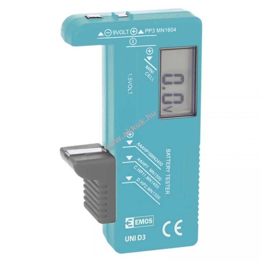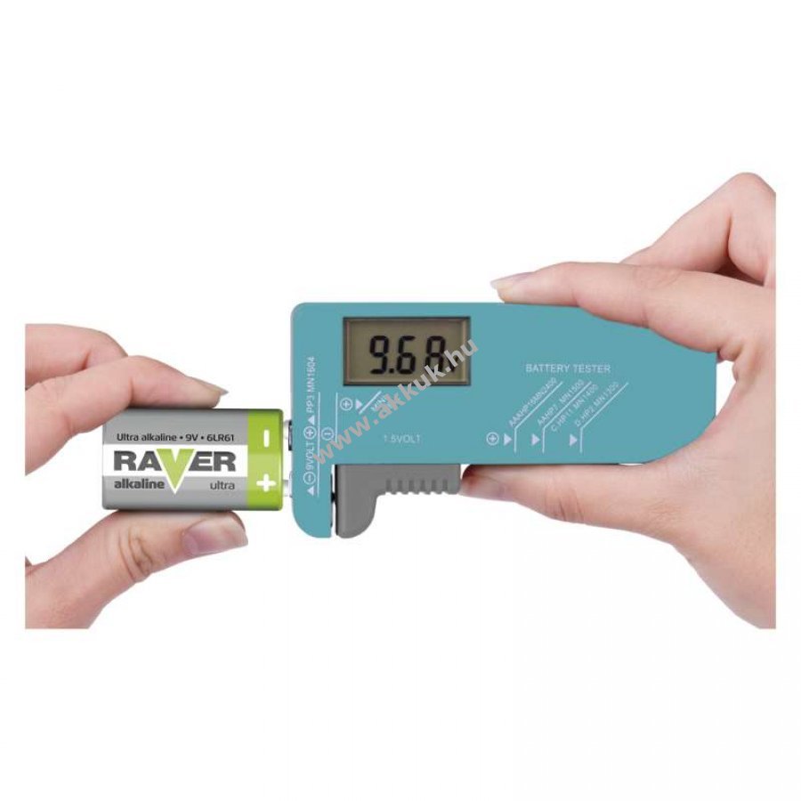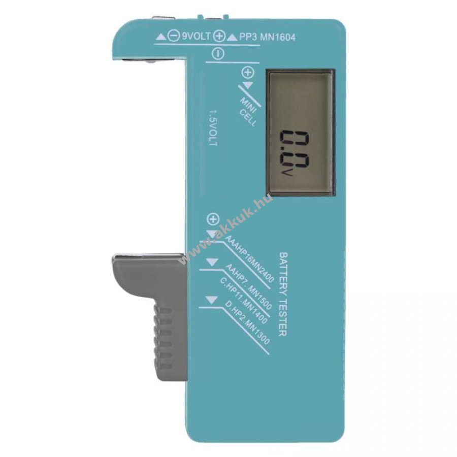 LCD-kijelzős elemtesztelo minden 1,5V-os AAA, AA, C, D, 9V elemkhez és 1,5 V-os gombelemekhez.