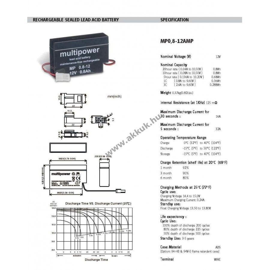 12V 800mAh/9,6Wh SLA fekete 96mm x 25mm x 62mm 37 gr. MULTIPOWER Szavatosság (további részletek)