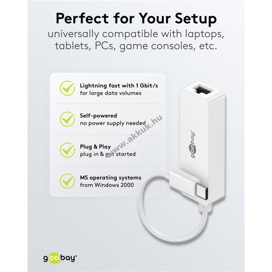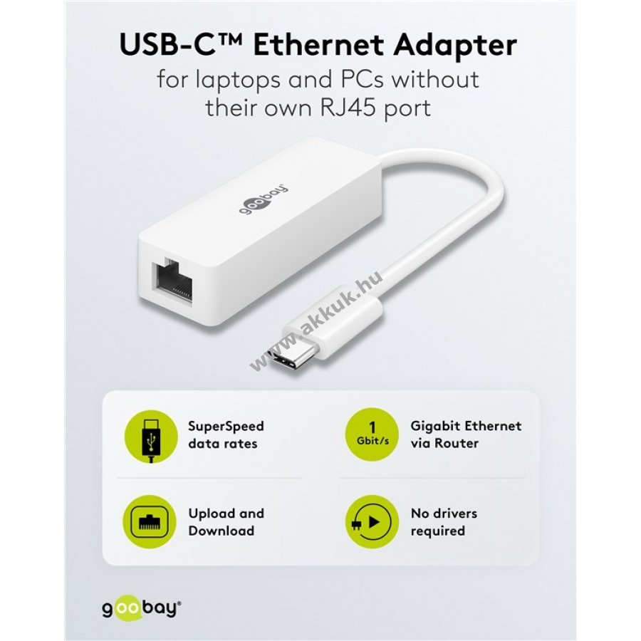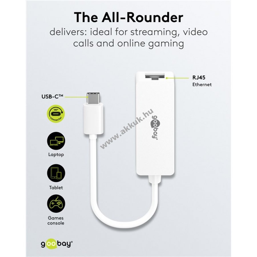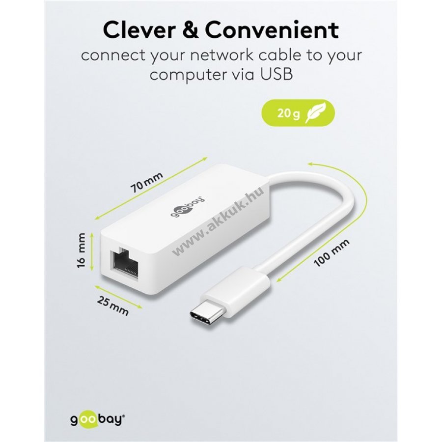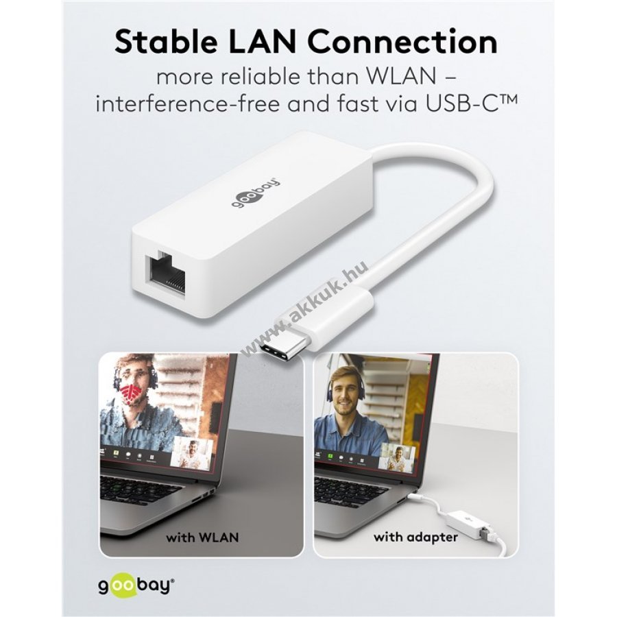 Kábeles internetkapcsolat stabilabb a WLAN-nál de a laptop nem rendelkezik Ethernet porttal A Goobay LAN USB-C adapter egyszerűen csatlakoztatja a számítógépet hálózati kábelhez
