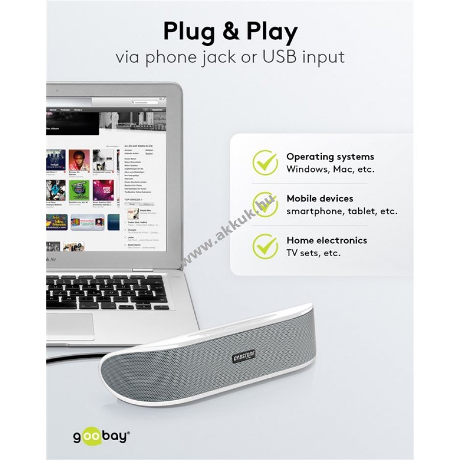 Cabstone SoundBar fehér álló karton sztereó hangszóró USB Plug 'n Play csatlakozóval és AUX-bemenetes 2-utas hangrendszerrel 2 x 3,0 W teljesítménnyel és passzív mélynyomóval integrált hangkártyával a Plug n Play USB digitális erősítőn keresztül a figyelemre méltó hangzásért AUX kompatibilis számos okostelefonnal , táblagépek és egyéb eszközök, az AAA elemtartó rekesz lehetővé teszi azok bármikori cseréjét Figyelem ez egy gépi fordítás, amennyiben hibát talál kérjük jelezze felénk.