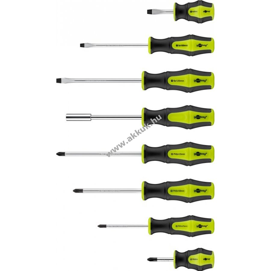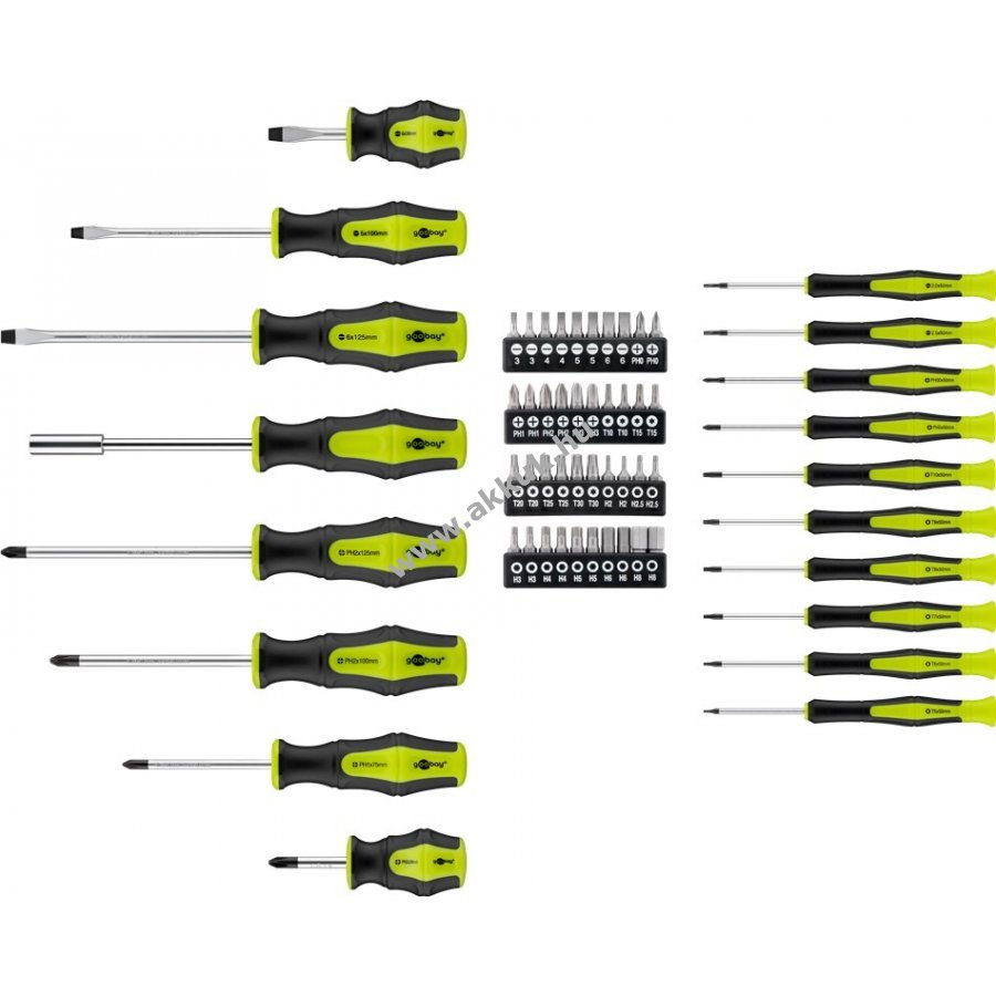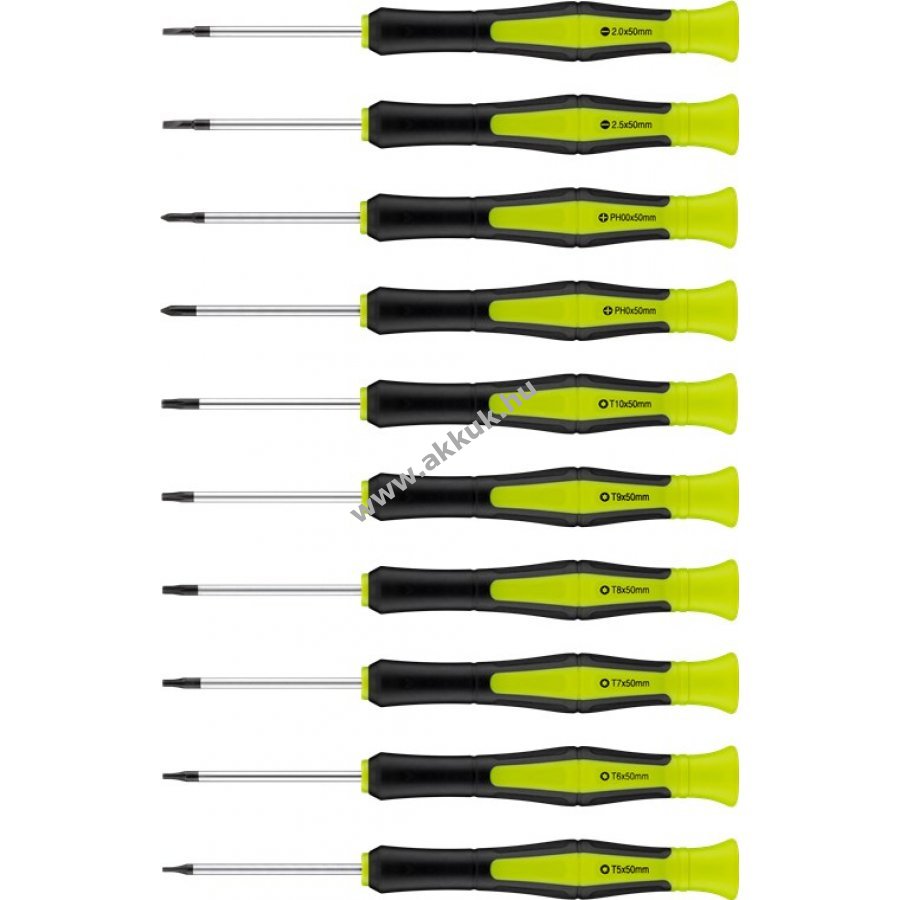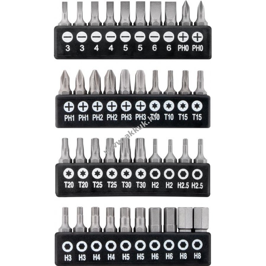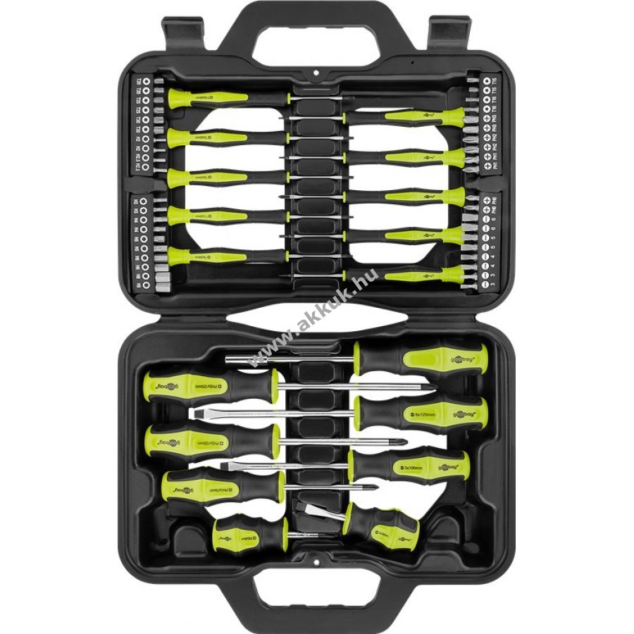 Alkalmas minden általános csavarozási és összeszerelési munkához, valamint a finommechanikai munkákhoz. 3db hornyos csavarhúzó: 6 x 125 mm, 5 x 100 mm, 6 x 38 mm 4db Phillips csavarhúzó: PH2 x 125 mm, PH2 x 100 mm, PH1 x 75 mm, PH2 x38 mm 1db bit tartó 2db precíziós horonycsavarhúzó: 2,5 x 50 mm, 2 x 50 mm 2db precíziós Phillips csavarhúzó: 2,5 x 50 mm, 2 x 50 mm 6db precíziós 6-fogú csavarhúzó: T5, T6, T7, T8, T9, T10 x 50 mm 40 bitet tartalmaz: 3 mm, 3 mm, 4 mm, 4 mm, 4 mm, 5 mm, 5 mm, 5 mm, 6 mm, 6 mm, 6 mm. 8db Phillips: PH0, PH0, PH1, PH1, PH2, PH2, PH3, PH3, PH3 10db 6 karimájú: T10, T10, T15, T15, T20, T25, T25, T30, T30, T30 14db külső 6-hüvelykes: H2, H2.5, H2.5, H3, H3, H4, H4, H5, H5, H6, H6, H6, H8, H8