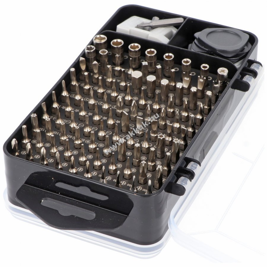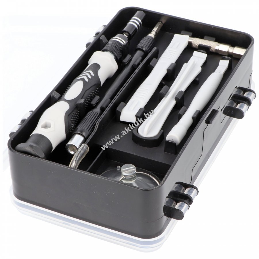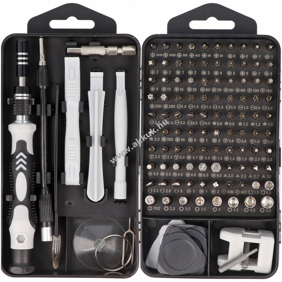 **Prémium precíziós szerszámkészlet amatőröknek és profiknak – mobiltelefon- és elektronikai javításokhoz** A **Handy iRepair készlet** egy professzionális szerszámkészlet, amely ideális iPhone, okostelefon, iPad, tablet PC, notebook, laptop, játékkonzol, PC, e-book olvasó, játékok és sok más elektronikus eszköz javításához. Saját maga is könnyedén **megnyithatja és megjavíthatja készülékét** – legyen szó kijelzőcseréről, akkumulátor ki- vagy beszerelésről, ház szétszereléséről vagy alkatrészek cseréjéről. Alkalmas: * kijelzők, akkumulátorok, kamerák, házak nyitására * akkumulátorok és alkatrészek ki-/beszerelésére * finommechanikai munkákra különféle készülékeknél A készlet tartalmaz:* **bithordozót / csavarhúzót ergonomikus, csúszásmentes markolattal** * **praktikus tárolóbőröndöt** az összes elem számára. Röviden és tömören: Ez a kompakt és sokoldalú precíziós bit- és szerszámkészlet ideális választás bárkinek, aki elektronikai eszközök javításával foglalkozik – akár hobbiból, akár hivatásszerűen. **AccuCell precíziós szerszámkészlet mobiltelefon és elektronikai javításhoz – amatőröknek és profiknak** A készlet tartalma: **Bitek típusa és méretek szerint:** * **12 Torx bit**: T1, T2, T3, T4, T5, T6, T7, T8, T9, T10, T15, T20 * **8 Torx-TR (biztonsági Torx) bit**: T6H, T7H, T8H, T9H, T10H, T15H, T20H, T25H * **13 hatszög (belső) bit**: 0.7 / 0.9 / 1.0 / 1.3 / 1.5 / 2.0 / 2.5 / 3.0 / 3.5 / 4.0 / 4.5 / 5.0 / 6.0 * **12 kereszt (Philips) bit**: PH0000, PH000, PH00, PH0, PH1, PH2 – mindegyikből 2 db * **13 lapos (egyenes) bit**: 1.0, 1.3, 1.5, 2.0, 2.5 (ez utóbbiból 2 db), 3.0, 3.5, 4.0 * **6 Pentalobe bit**: 0.8, 1.2 (mindkettőből 2 db), 1.5, 2.0 * **5 Pozidriv bit**: PZ000, PZ00, PZ0, PZ1, PZ2 * **3 négyzet (square) bit**: SQ0, SQ1, SQ2 * **4 háromszög (triangular) bit**: 2.0, 2.3, 2.7, 3.0 * **1 SIM tű, 1 MID bit, 3 U-alakú feszítő bit**: U2.3, U2.6, U8 * **7 Tri-Wing bit**: 0.6, 1.5 (ebből 2 db), 2.0, 2.3, 3.0 * **7 hatszög (külső) bit**: M2.5, M3.0, M3.5, M4.0, M4.5, M5.0, M5.5 * **1 Phillips bit**: PH2 * **2 Bristol 6-spline bit**: G3.8, G4.5 **További tartozékok:** * 1 lapos csipesz, * Hosszabbítórúd, * 1/4"–4 mm adapter, * Hajlékony hosszabbító (alumíniumból), * 3 feszítő szerszám, * 8 háromszög alakú nyitópálca, * Mágneses/lemágnesező egység, * Tapadókorong * SIM-kártya tálca nyitó eszköz (pl. iPhone, iPad készülékhez). **Praktikus és mobil kialakítás** * Masszív **szállítókofferrel** és **2 átlátszó fedéllel**, amelyek biztosítják a rendezett és biztonságos tárolást. * **Mini szerszámkészlet tárolódobozzal** – ideális okostelefonok, PC-k, laptopok, e-book olvasók, táblagépek és más finommechanikai eszközök szervizeléséhez. * A mai világban, ahol a mobil eszközök és elektronikus játékok egyre elterjedtebbek, elengedhetetlen a megfelelő szerszám a **batteria- és akkucsere**, a **szétszerelés** vagy **javítás** elvégzéséhez. **Előnyök egy pillantásra:** * Teljes körű kompatibilitás a legtöbb elektronikai eszközzel * Ideális otthoni barkácsolók és profi szervizesek számára is * Kompakt, hordozható, mégis rendkívül sokoldalú * Majdnem minden speciális bitet tartalmaz, amit elektronikai készülékekhez használni lehet