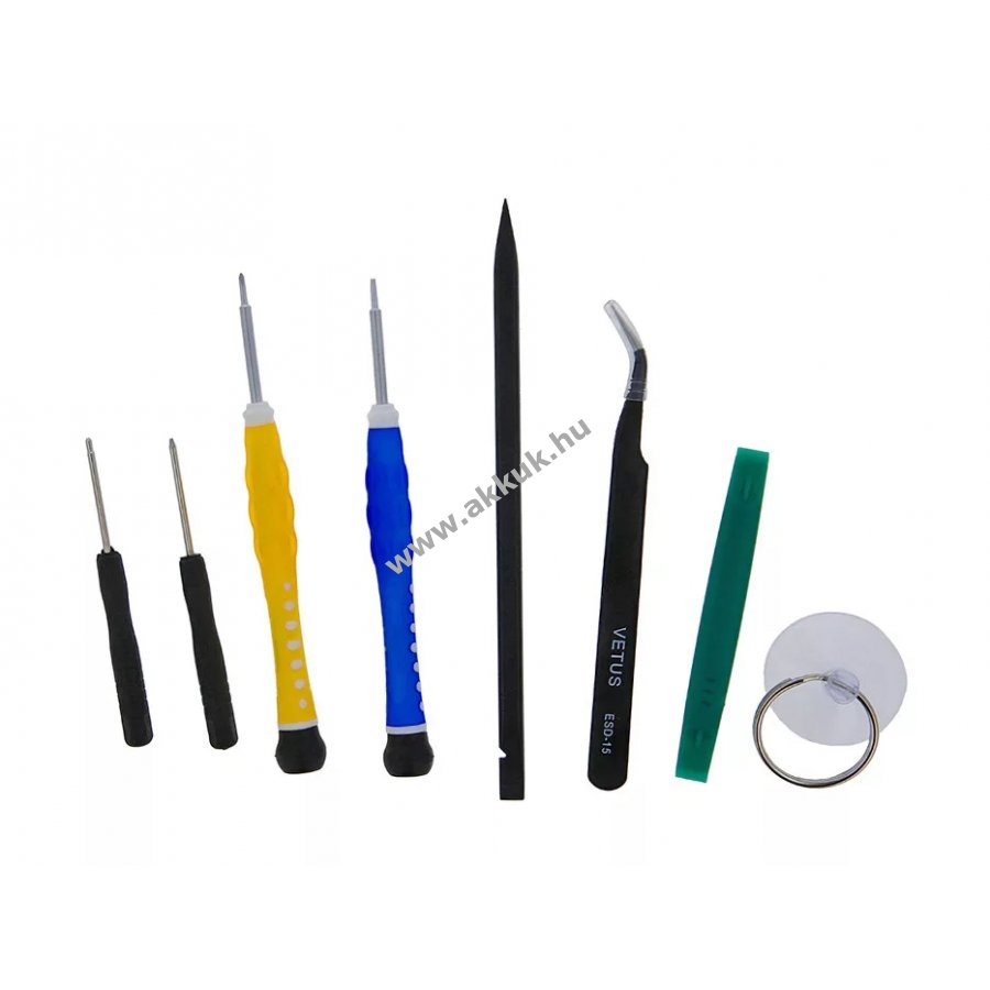8 szerszámból álló készlet mindenféle elektronikus eszköz kinyitásához. A készlet a következőket tartalmazza: 1,5 x 20 mm-es lapos csavarhúzó 1,5 x 20 mm-es Phillips csavarhúzó - Ötágú csillagcsavarhúzó - Pentalobe - Phillips csavarhúzó Eszköz az akkumulátor könnyű eltávolításához, a szalagok eltávolításához Eszköz a ház kinyitásához és kiemeléséhez (széles) Tapadókorong a képernyő lehúzásához - Antisztatikus fémcsipesz