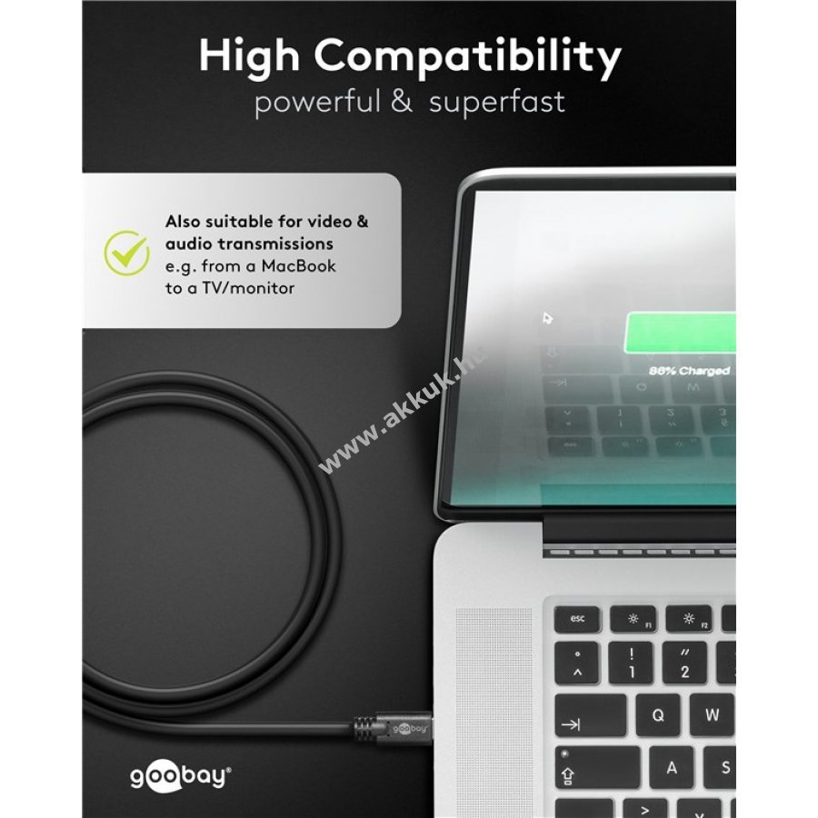 Nagyon gyors adatátvitel akár 5 Gbit/s sebességgel és hatékony töltés Power Delivery technológiával. Támogatja a 4K felbontást 60 Hz-en a tiszta videóélményért. 60 W teljesítménnyel ideális laptopok, tabletek, SSD-k és játékkonzolok töltéséhez. Kompatibilis Thunderbolt 3 és 4 portokkal valamint népszerű márkák készülékeivel mint Lenovo HP Dell Apple MacBook és iPad. Használható otthon irodában vagy útközben gyors adatátvitel és töltés biztosítására.