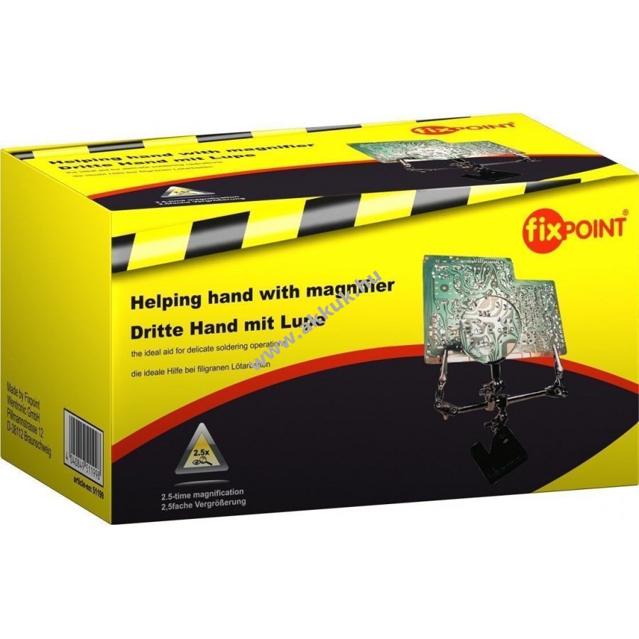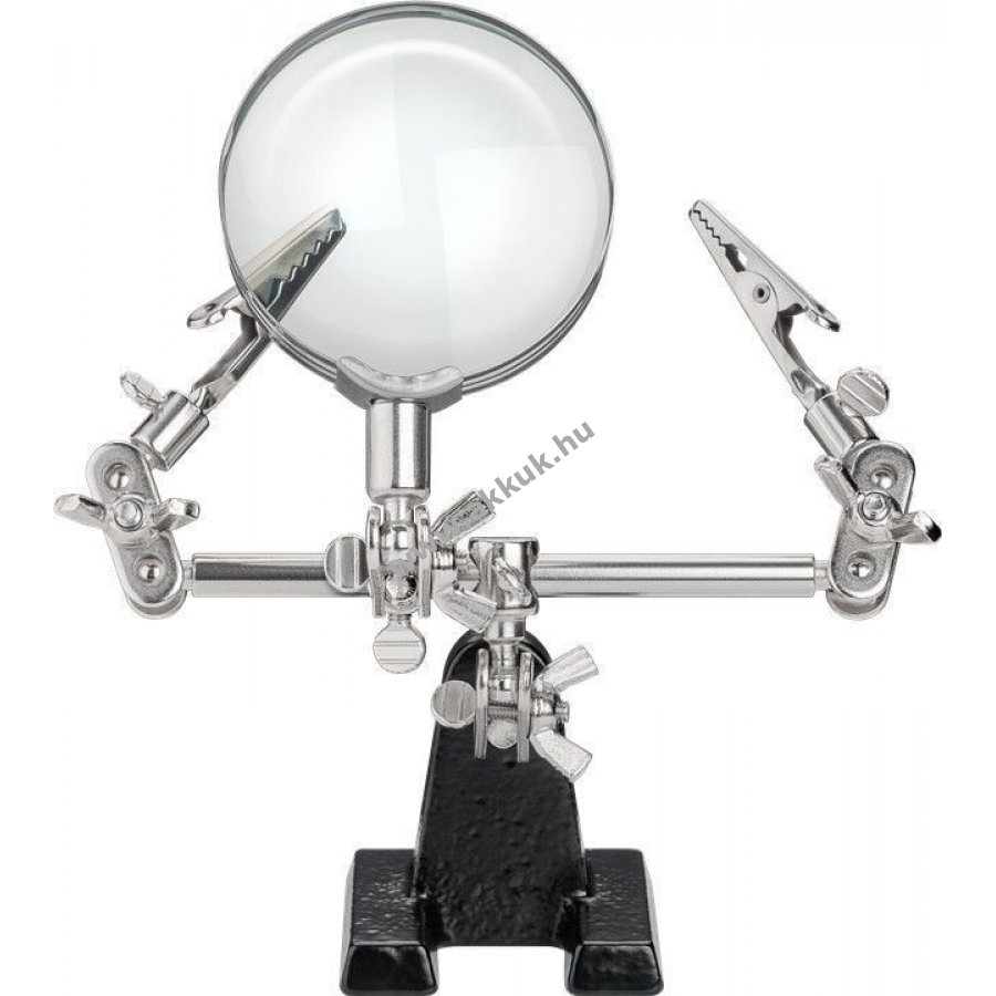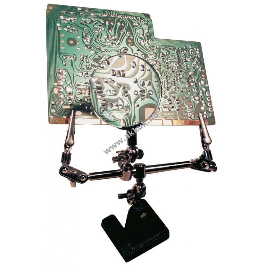 Forrasztó állvány nagyítóval A rendkívül jól beállítható állvány gömbcsuklóival (8db), mozgatható karokkal (2db), szorítópofákkal és egy nagyítóval könnyíti meg munkáját, amelynek átmérője 59,7mm, és 2,5x nagyításal rendelkezik. Ideális segédeszköz, ahol mindkét kézre szükség van.