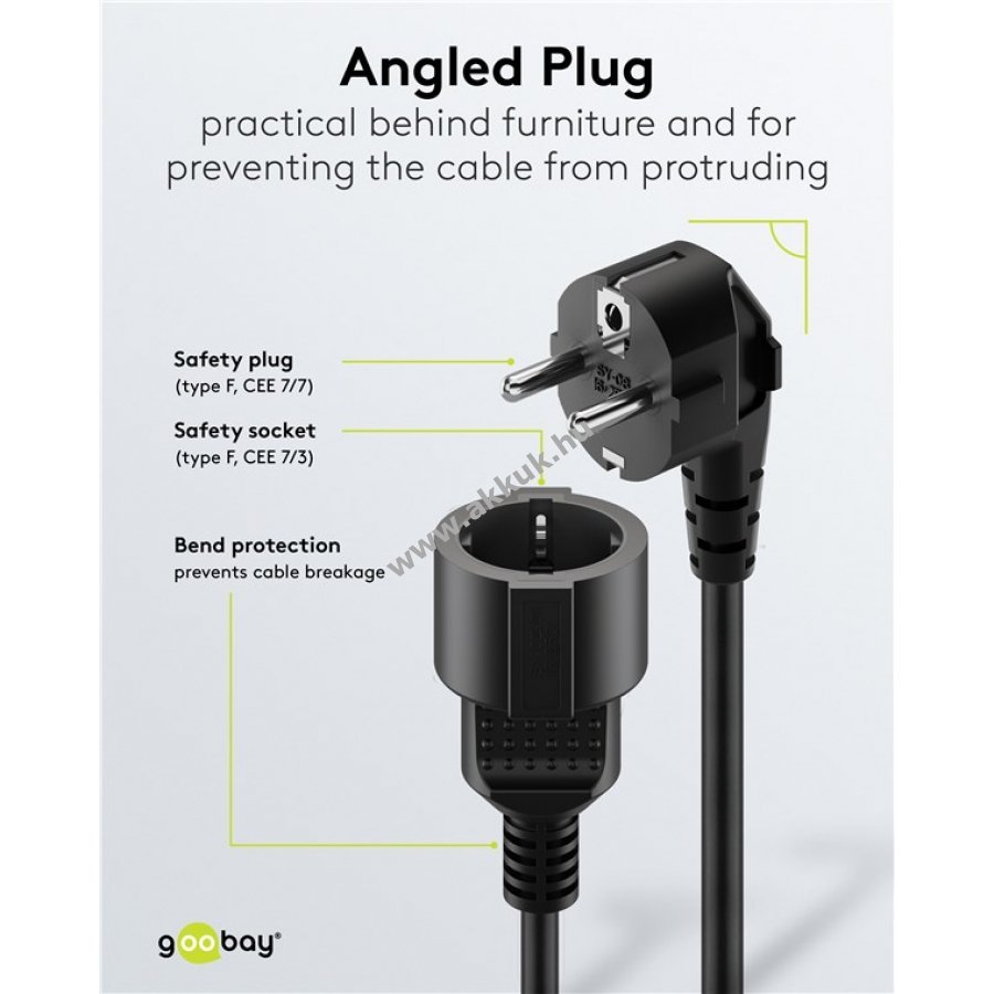 - 90°-os védőérintkezős dugó (Typ E/F, CEE 7/7) a helytakarékos csatlakozáshoz