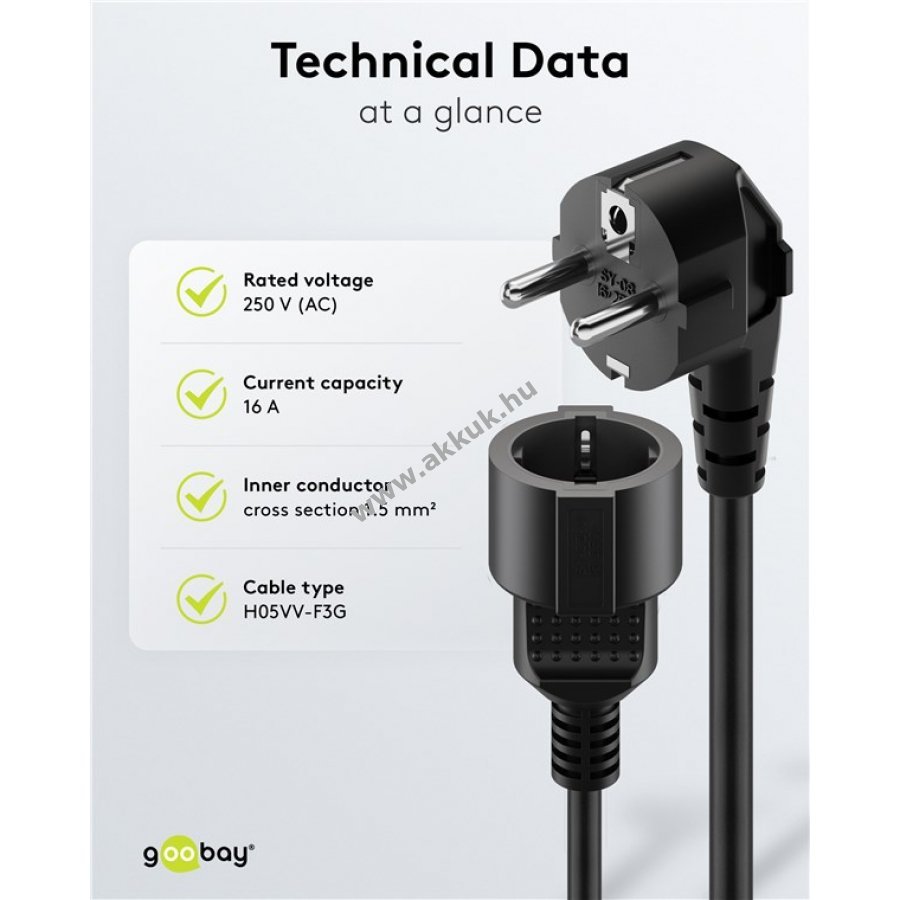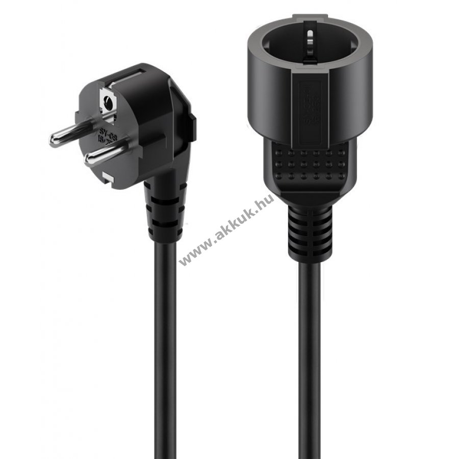 Hosszabbító kábel védőérintkezős hálózati csatlakozókhoz, 5m, 3x1,5mm2, fekete. Ideális közepes mechanikai igénybevételű készülékek csatlakoztatásához beltéren. Helytakarékos kialakítás az elfordított dugónak köszönhetően, érintésvédelemmel.