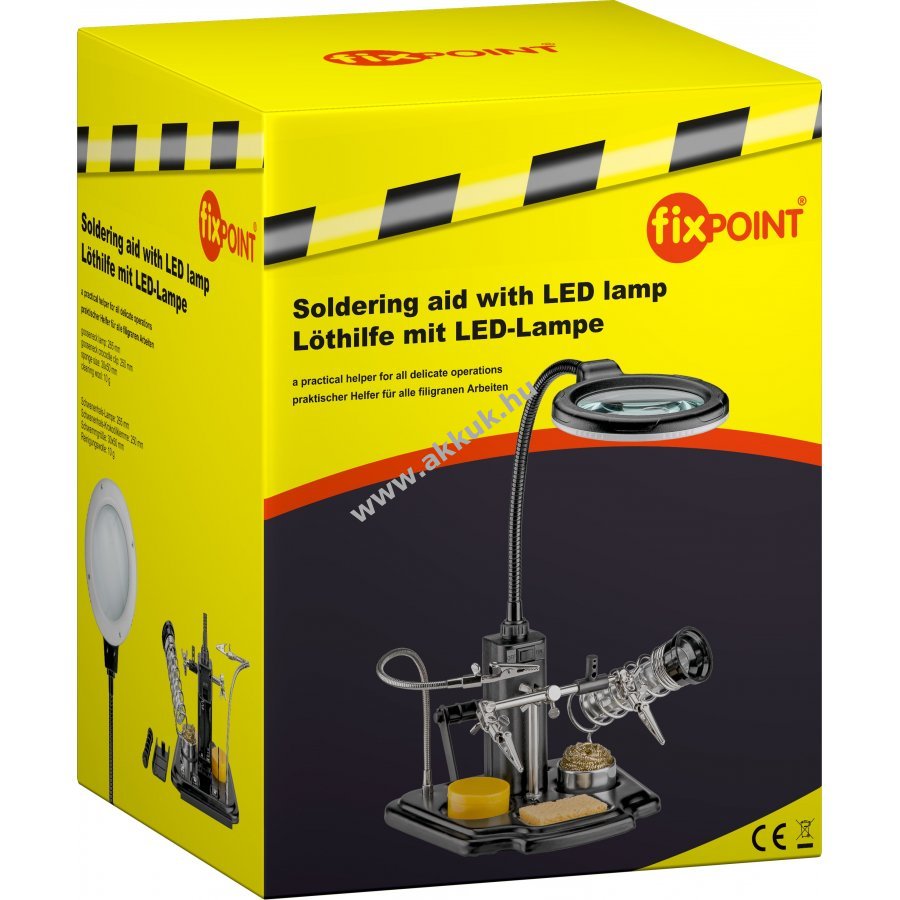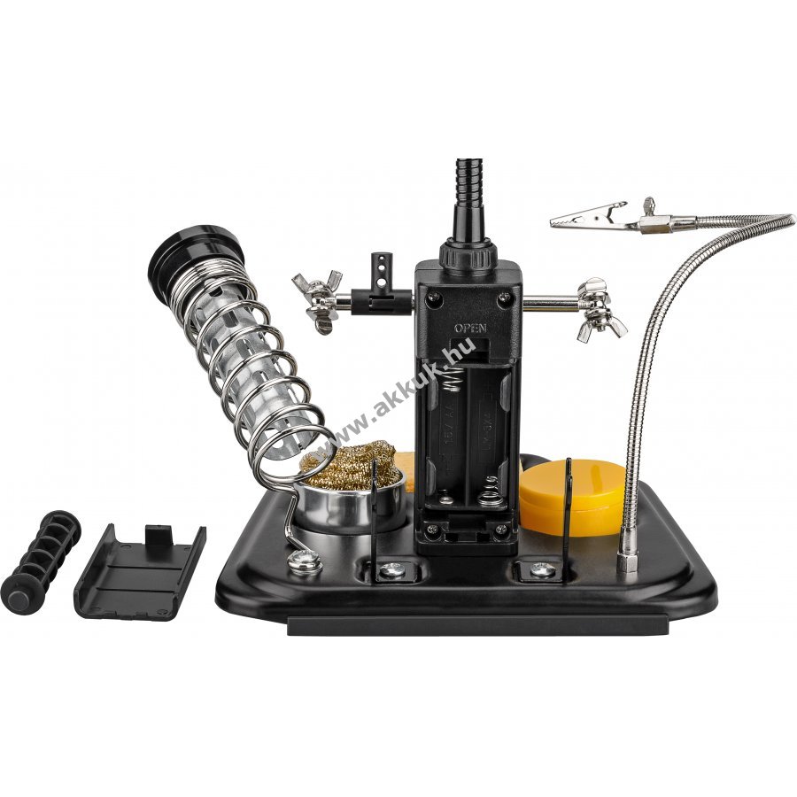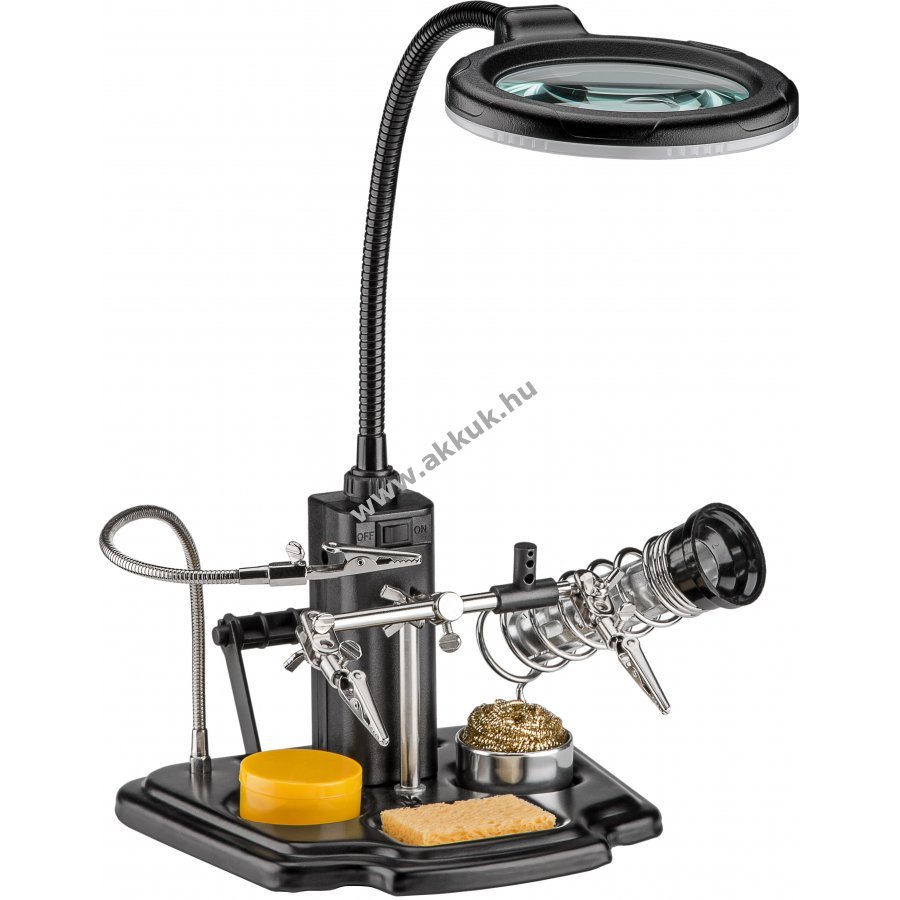 Fixpoint forrasztó állvány a precíz munkához nagyítóval - LED megvilágítással Hattyúnyaku lámpa: 265mm hattyúnyak krokodil csipesz: 250mm Szivacsméret: 30x50 mm tisztító: 10g Nincsen remegés, dölöngélés, az eros csipesznek köszönhetően. 3x nagyítólencse (90mm) 16 LED-es megvilágítással a részletes munkavégzéshez. Beépített forrasztópáka tartó, szivacs és tisztító anyag. Működéséhez 4x LR6 (AA) 1,5 V elem szükséges! (A csomag nem tartalmazza.)