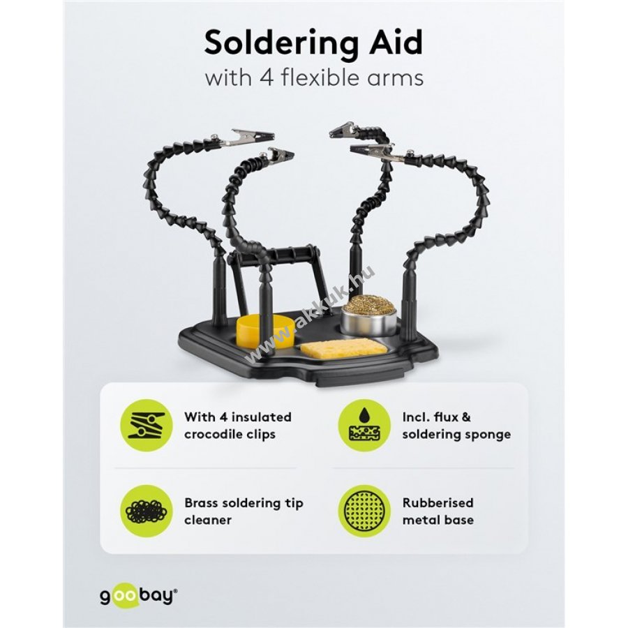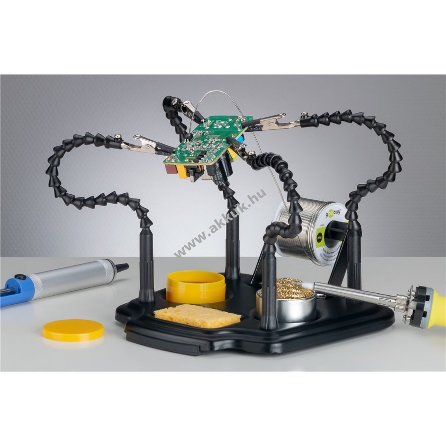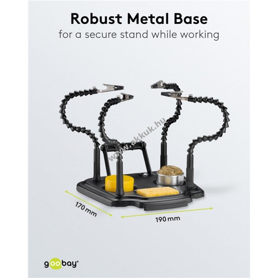 A forrasztási segédeszköz 4 rugalmas lágynyakú karral és krokodilcsipesszel megbízható harmadik kéz a forrasztáshoz, festéshez és kézműves munkákhoz. Tartó elektronikai alkatrészek, például áramköri lapok precíziós munkáihoz, ideális modellépítéshez, kézművességhez és ékszerjavításhoz is. A forrasztóállomás tökéletes kiegészítője, beépített forraszdrót-tartóval, tisztítószivaccsal, tisztítógyapjúval és forrasztófolyadékkal (gyantával) felszerelve. A sárgaréz forrasztóhegy-tisztító hatékonyan eltávolítja a forrasztóhegyeken lévő maradványokat, és megakadályozza a rozsdásodás kialakulását a hegy száraz tisztításával A tisztítószivacs eltávolítja a munka során felgyülemlett felesleges forraszanyagot és törmeléket A szigetelt krokodilcsipeszek nagyobb biztonságot nyújtanak az elektronikai munkák során, és védik a munkadarabot a sérüléstől A robusztus, nehéz fémalap (kb. 190 x 170 mm) a csúszásgátló gumiborítással biztos tartást biztosít munka közben