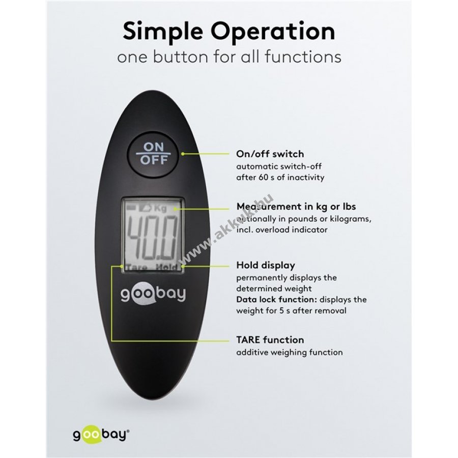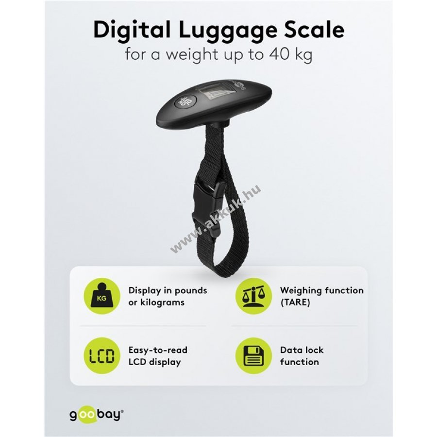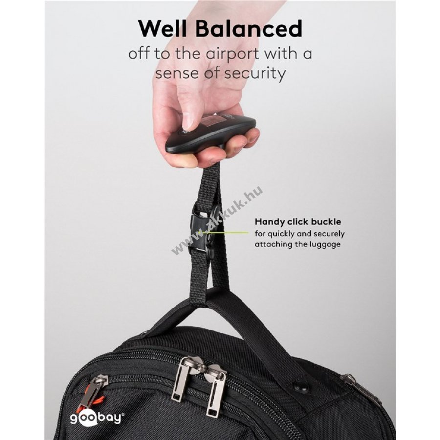 Digitális bőrönd mérleg, koffer mérleg 40kg-ig pontos méréssel, automatikus kikapcsolás, túlsúly mérés (TARA) és ergonómikus készülékforma valamint jól leolvasható LCD kijelző, robosztus kiképzés, egyszerű rögzítés minden egyes csomaghoz, választható súly kg vagy lb.