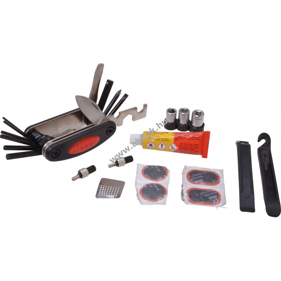 1db gumi oldat - 2db szelepgumi - 1db érdesítő szerszám - 4db folt - 2db gumiabroncs karok - 1db nejlon tasak övhurokkal - 1db 14 darabos multi szerszám: - 1db csavarhúzó (Phillips és réses), 1db adapter dugókulcskészlethez, 1db 8, 10 és 15 mm-es kulcs, 3db 8, 9, 10 mm-es dugókulcs, 1db penge, 1db gumikar.