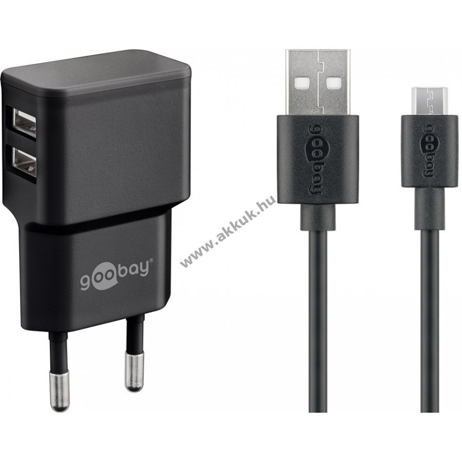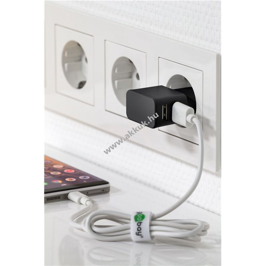 A Goobay 12W Micro-USB töltőkészlet egyszerre kínál két USB-A portot és 1m hosszú Micro-USB kábelt, kompakt kialakítása miatt utazáshoz ideális.