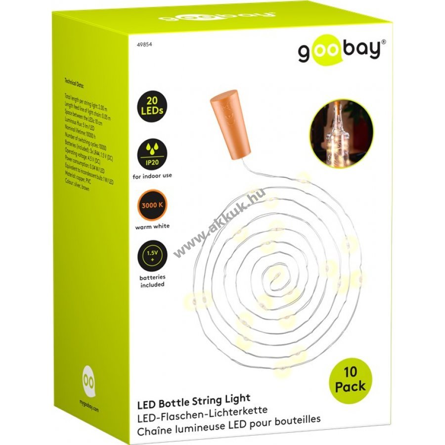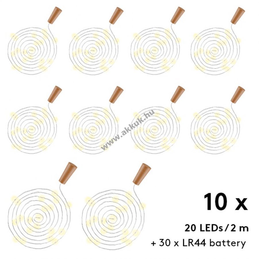 10 db üvegpalackos LED világítófűzér parafa dugóval, minden darab 20 melegfehér LED-del, hangulatos beltéri díszítéshez.