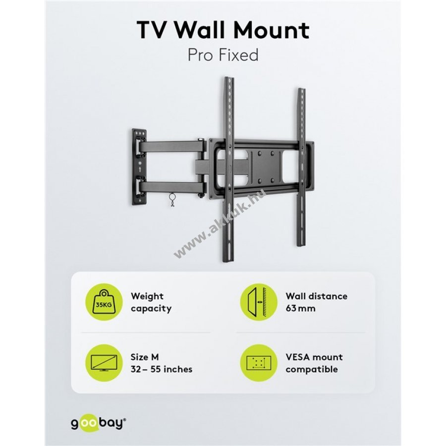 Teljes mozgathatóságú Fullmotion TV fali konzol, amely 32-55col (81-140cm) készülékekhez alkalmas és legfeljebb 35kg terhelést bír. Szerszám nélkül dönthető, forgatható, kihúzható és finoman állítható, beépített kábelrendező biztosít rendezettséget.