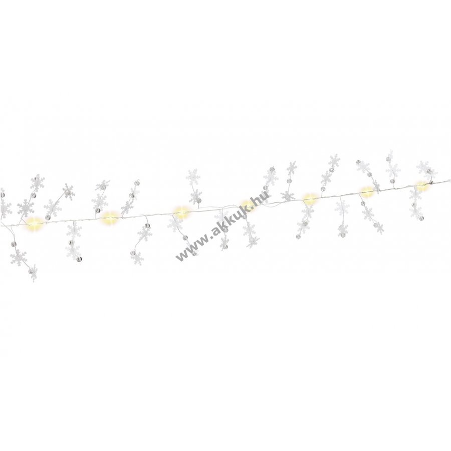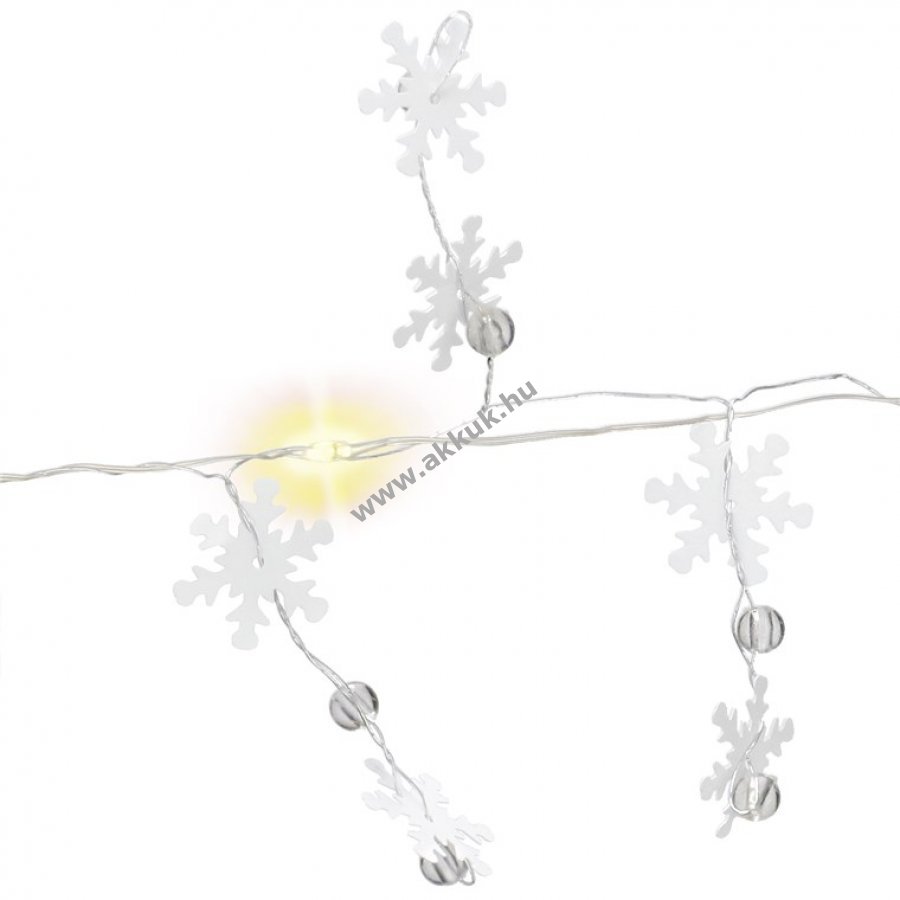 Időzítő funkcióval - 6 óra bekapcsolás / 18 óra kikapcsolás, 3 állású kapcsoló - ON / OFF / időzítő Teljes hossza 130 cm, vezeték 40 cm, a LED-ek közötti távolság 10 cm, átlátszó kábel Elemmel működtethető (2 x AA, nem tartozék) IP20 - beltéri használatra Hópelyhek fémből, fehér színű, kb. 2 x 2 x 0,1 cm, műanyag gyöngyök O 0,5 cm. Fehér fém hópelyhekkel és gyöngyökkel dekoratív díszként - hangulatos akcentust állít bármilyen kívánt helyre. A rugalmas fémhuzalnak köszönhetően ideálisan beépíthető edényekbe vagy beltéri karácsonyi dekorációba.