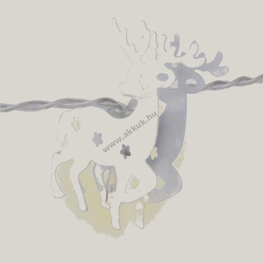 Időzítő funkcióval - 6 óra bekapcsolás / 18 óra kikapcsolás, 3 állású kapcsoló - ON / OFF / időzítő Teljes hossza 130 cm, vezeték 40 cm, a LED-ek közötti távolság 10 cm, átlátszó kábel Elemmel működtethető (2 x AA, nem tartozék) IP20 - beltéri használatra Fémből készült függők, fehér, kb. 5 x 6 x 1 cm Ez a LED-es fénylánc különleges látványt nyújt a téli és karácsonyi napokon A hatást kiemelik a fehér fémből készült figurák két oldalán kivájt csillagok, amelyeken keresztül melegfehér fény hull át