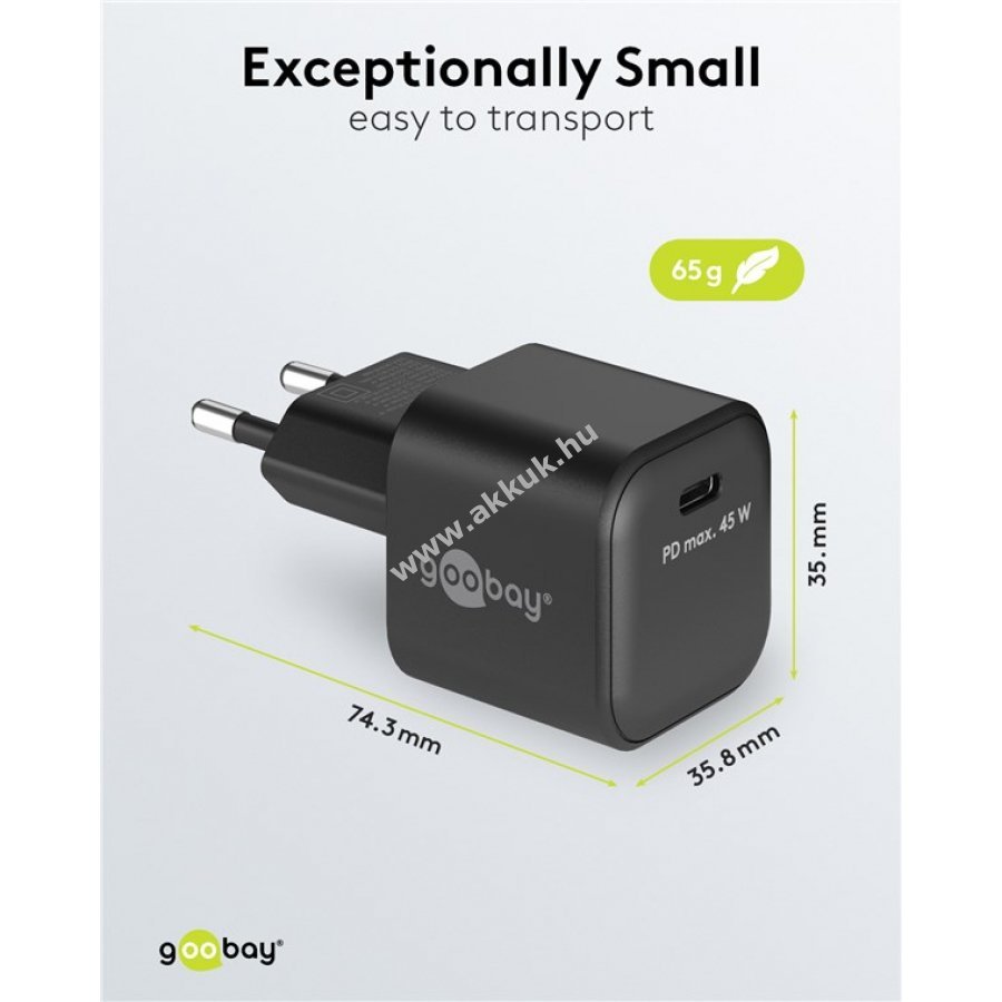 Kis méretű és nagy teljesítményű USB-C gyorstöltő GaN technológiával 45W teljesítménnyel. Magas energiahatékonyság és univerzális USB-C csatlakozó egy készülékben. Gyors és megbízható töltés Bluetooth fejhallgatótól laptopig. Power Delivery támogatással gyors töltést biztosít okostelefonoknak. GaN félvezetők gyorsabb és hatékonyabb töltést tesznek lehetővé, miközben a töltő könnyebb és kompaktabb a hagyományos eszközöknél. Kis helyigényű és könnyű kialakítás ideális utazáshoz. Kompatibilis Apple iPhone, Samsung, Xiaomi, LG, Huawei okostelefonokkal, Apple iPad tabletekkel és Acer, HP, Fujitsu, Razer notebookokkal.