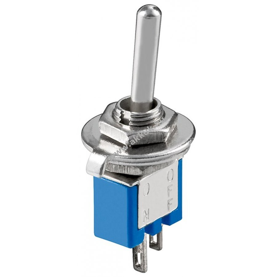 Billenőkapcsoló 2 tűvel forrasztáshoz kék házzal 3A 125V maximális terheléssel. 2 állású kapcsoló be- vagy kikapcsolt helyzettel. A kapcsoló karja fém anyagból készült.