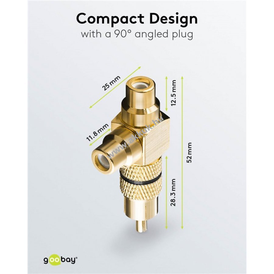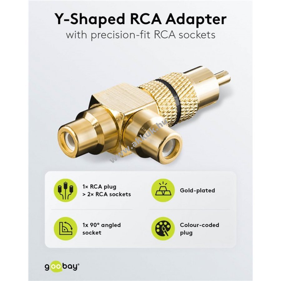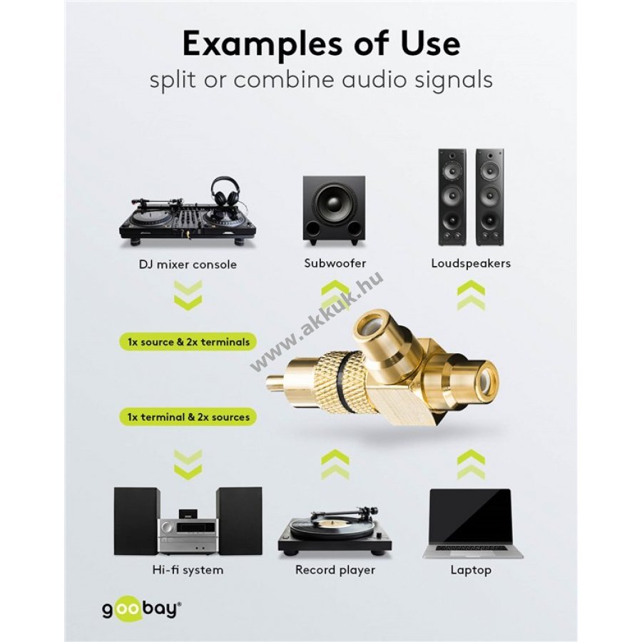 A Cinch elosztó egy bemeneti Cinch aljzatról két kimeneti aljzatra osztja a hangjelet.