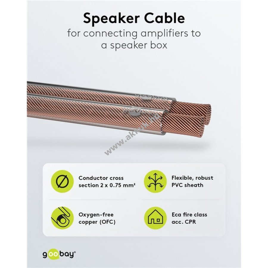 A Goobay hangszórókábel kiváló minőségű oxigénmentes réz vezetővel biztosítja a maximális hangátvitelt Hi-Fi rendszerekhez. A rugalmas és tartós PVC köpeny megkönnyíti a kábel hajlítását és elhelyezését. A polaritásjelölés segíti a helyes bekötést és egyszerű szerelést.