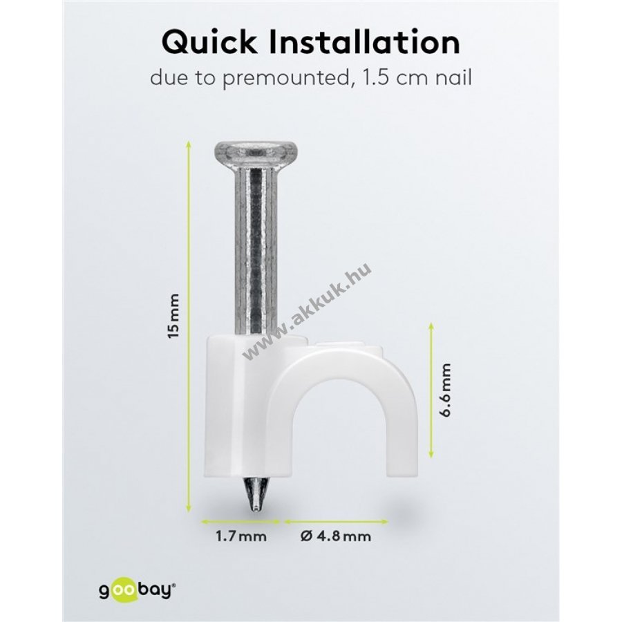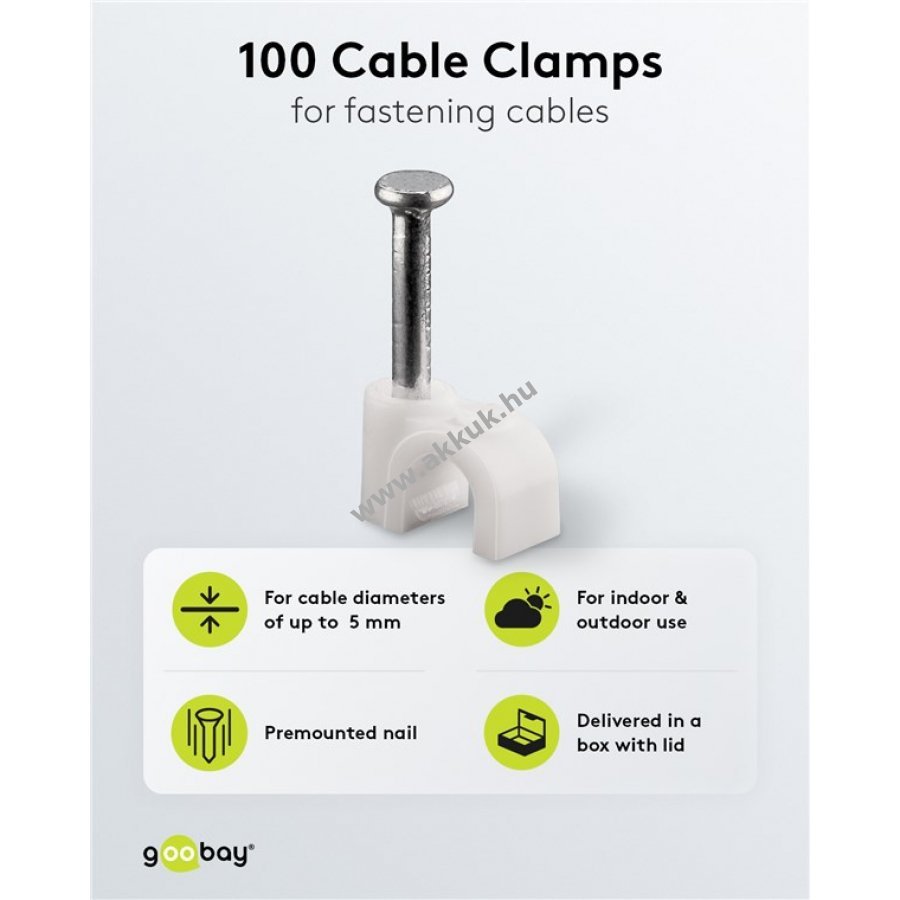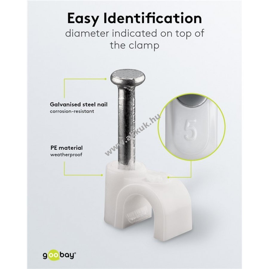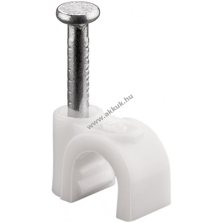 Kábelrendező bilincs 5 mm átmérőjű kábelekhez falra ajtókeretre és sarkokba való rögzítéshez. Stabilizált PE műanyagból és cinkezett acél szeggel készült. Belső és külső használatra egyaránt alkalmas kiváló szigeteléssel korrózió- és öregedésállósággal.