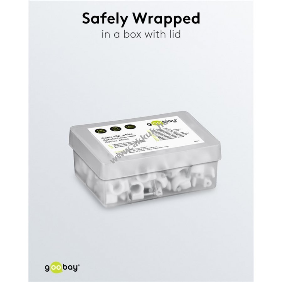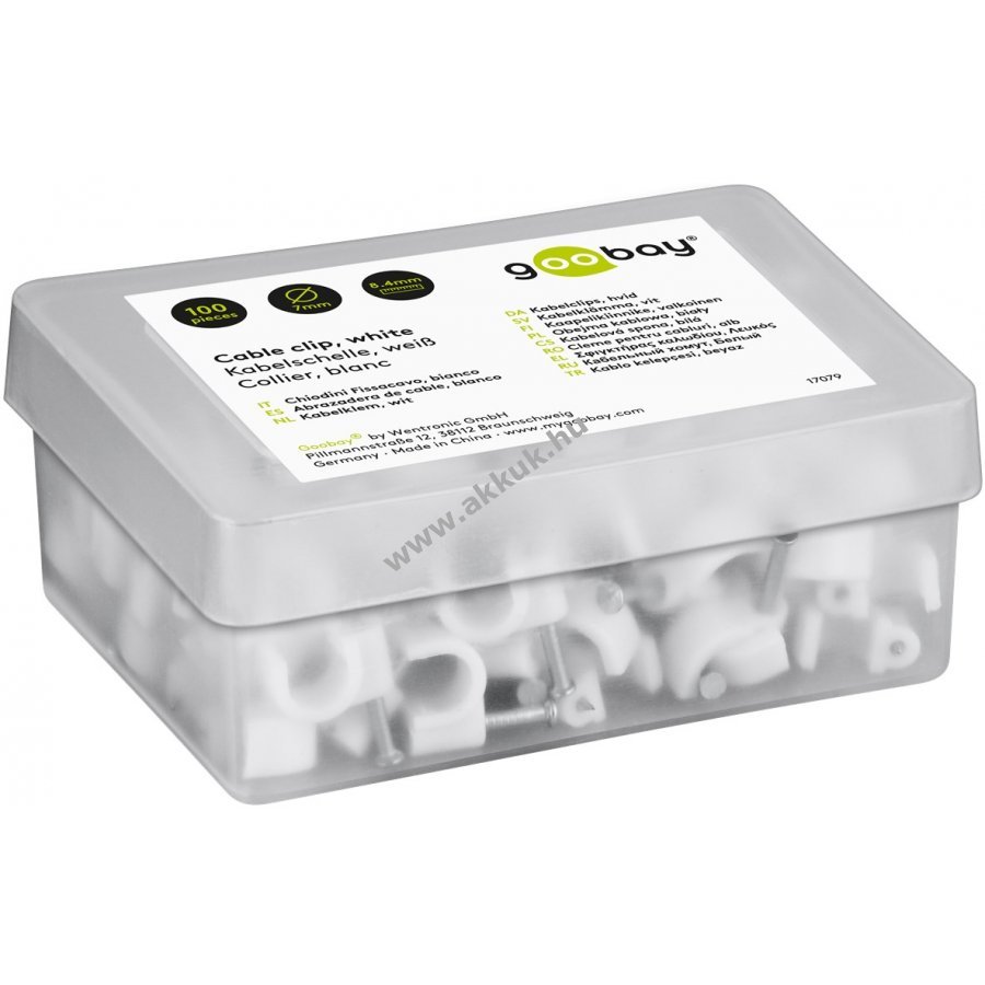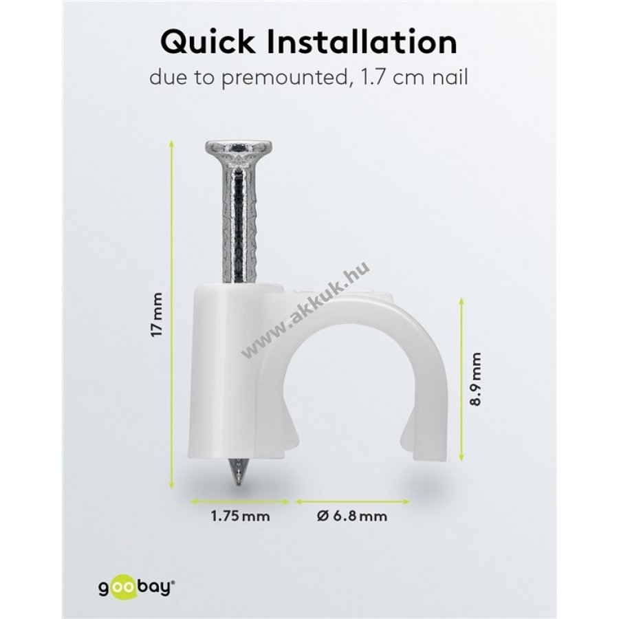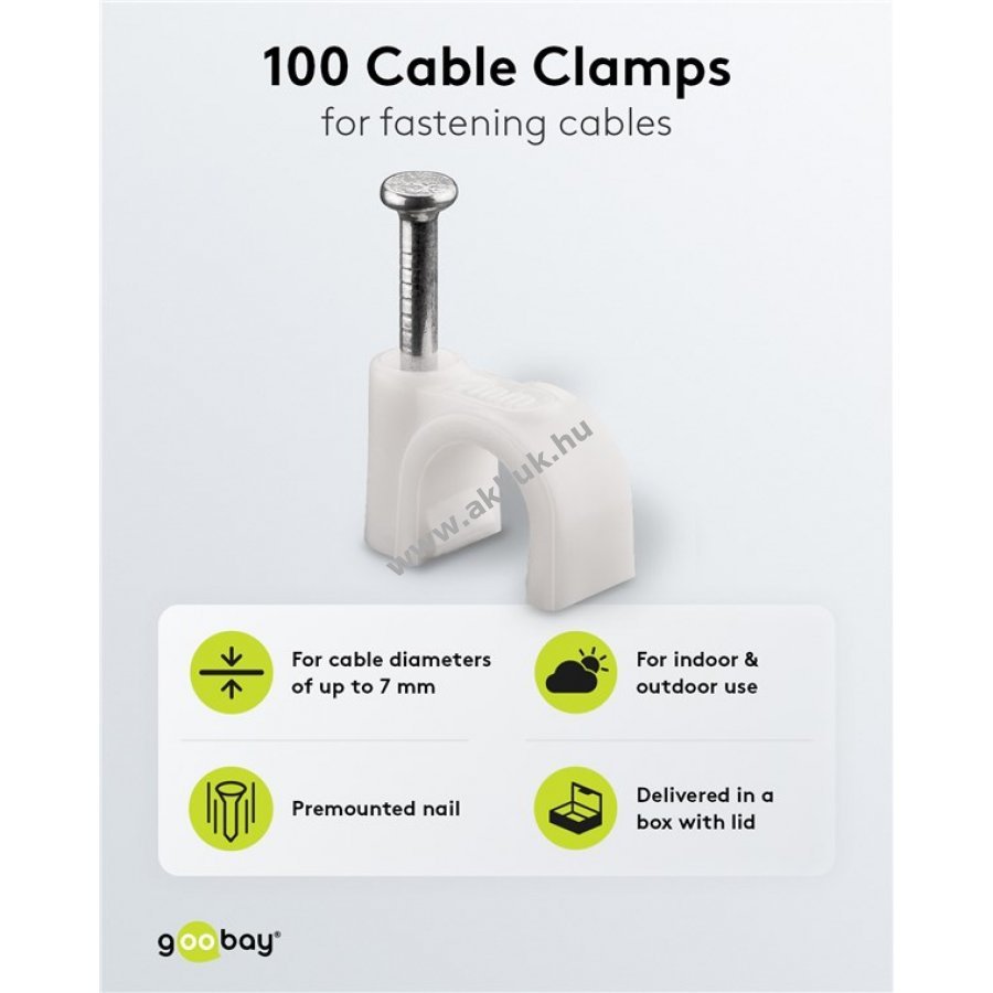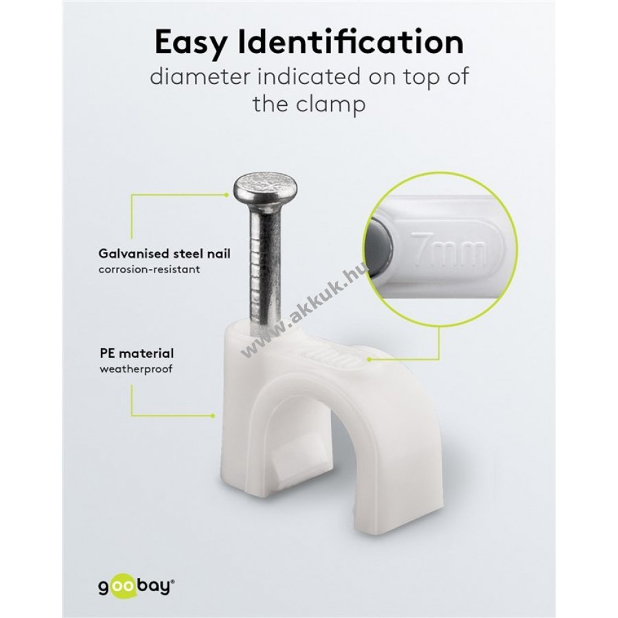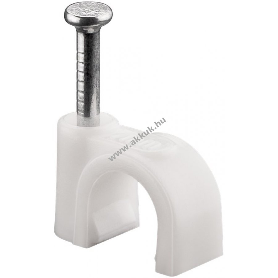 Kábelrendező bilincs kábelek rögzítéséhez falon ajtókereten és sarkokban. Stabilizált PE műanyagból és cinkezett acél szeggel készült. Beltéri és kültéri használatra egyaránt alkalmas jó szigeteléssel korrózió- és öregedésálló.
