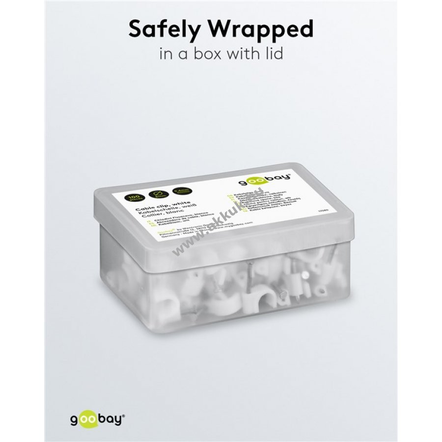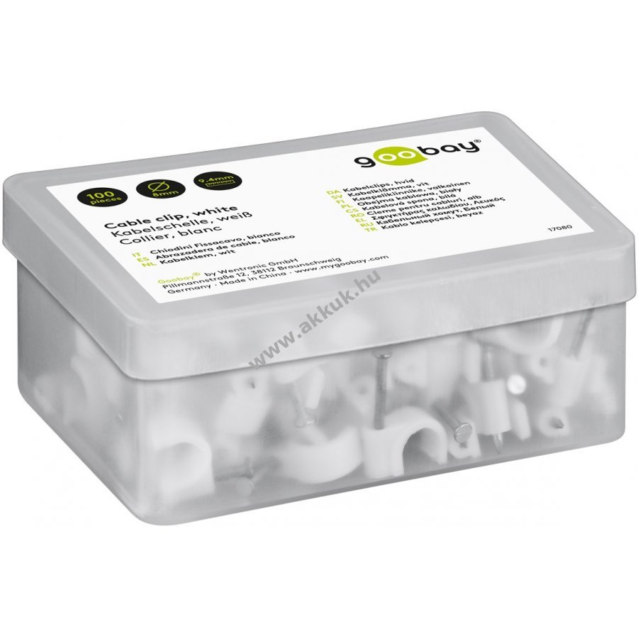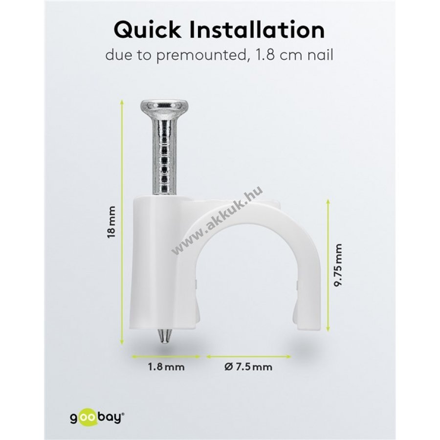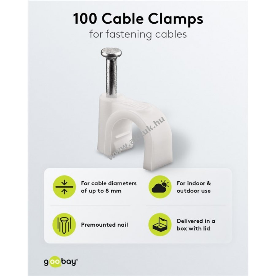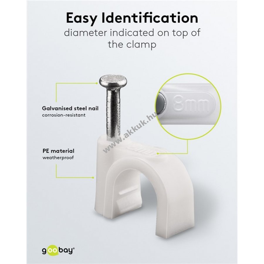 Kábelrendező bilincs 8 mm átmérőjű kábelekhez falra ajtókerethez és sarkokhoz. Magas minőségű stabilizált PE műanyag és cinkezett acél szeg. Beltéri és kültéri használatra alkalmas jó szigeteléssel korrózió- és öregedésálló.