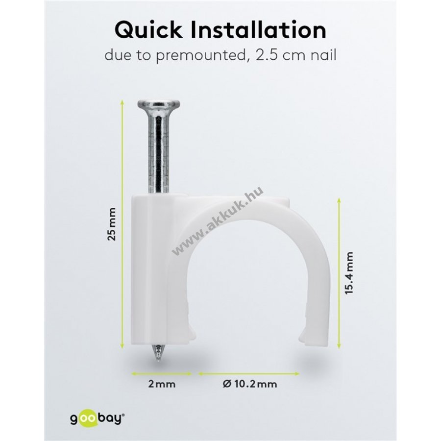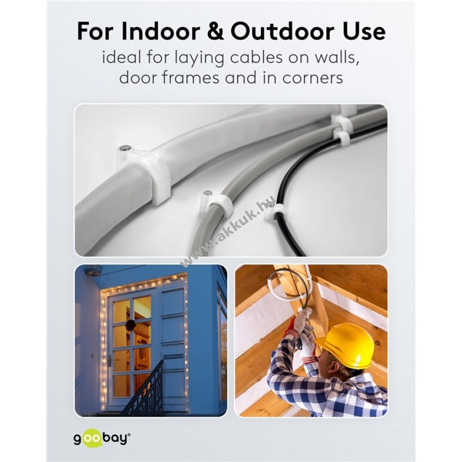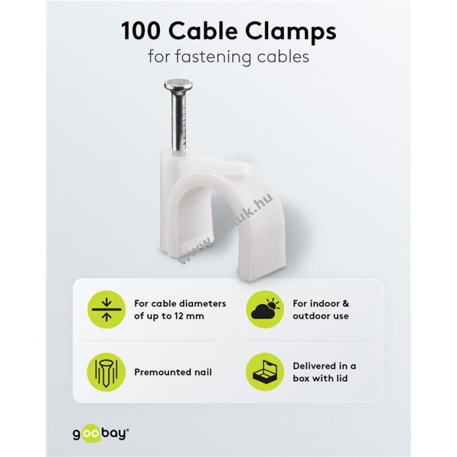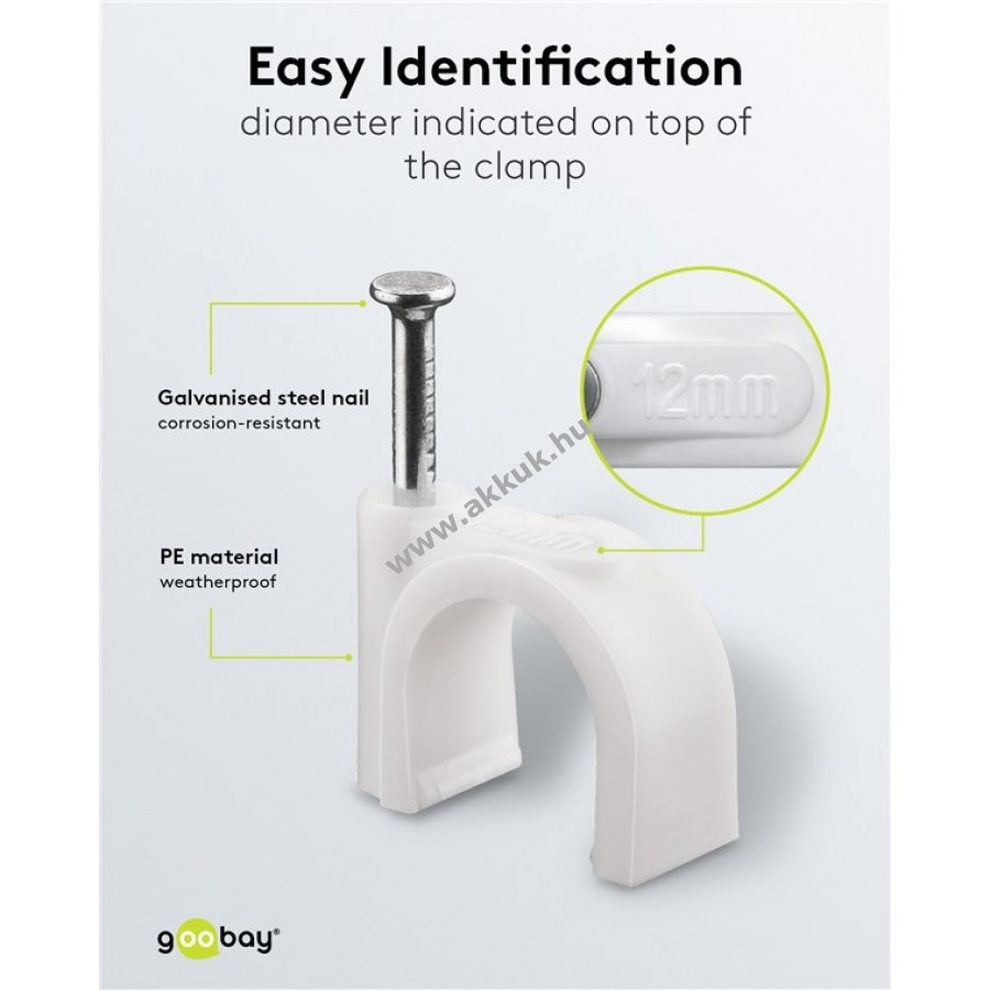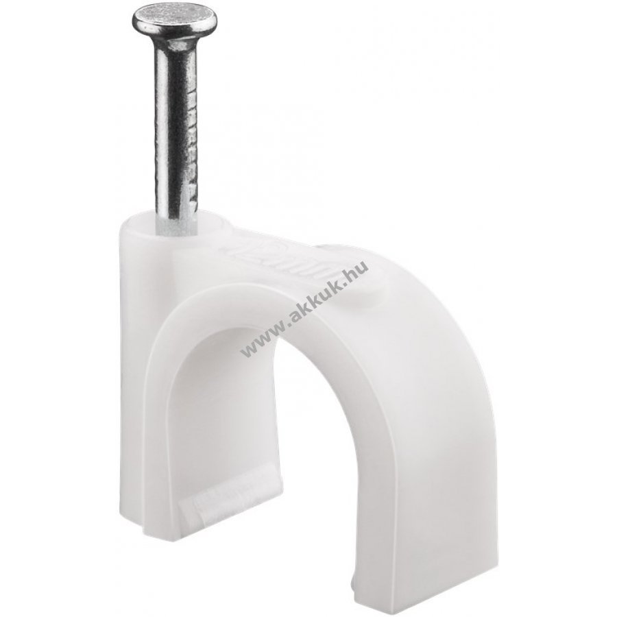 Kábelrendező bilincs 12 mm átmérőjű kábelekhez falra ajtókeretre és sarkokhoz. Magas minőségű stabilizált PE műanyag és cinkezett acél szeg. Beltéri és kültéri használatra egyaránt alkalmas jó szigeteléssel korrózió- és öregedésállósággal.