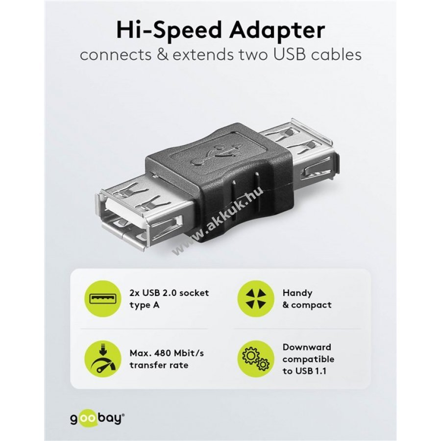 USB-A csatlakozó két USB-A aljzattal két USB-kábel összekapcsolásához és meghosszabbításához Praktikus megoldás új hosszú kábel vásárlása nélkül Alkalmas gender changerként is USB-csatlakozó aljzatra alakításához USB 2.0 szabvány 480 Mbit/s adatátviteli sebességgel Kompakt méret szűk helyeken is elhelyezhető például szekrény vagy TV mögött Kompatibilis minden szabványos USB-A kábelhez és csatlakozóhoz például USB-hubokhoz billentyűzetekhez egerekhez webkamerákhoz Minden népszerű operációs rendszerrel kompatibilis például Windows macOS Linux USB 1.1 szabvánnyal is visszafelé kompatibilis