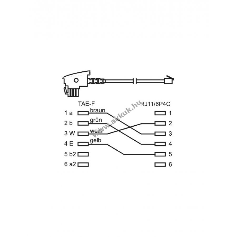 Egyik végén TAE-F csatlakozó hajlításvédelemmel a másik végén RJ11 csatlakozó reteszeléssel és aranyozott érintkezőkkel