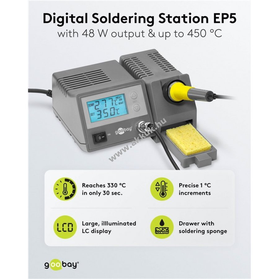 A 48 W teljesítményű forrasztóhegy kb. 90 másodperc alatt eléri a 330 °C-ot.