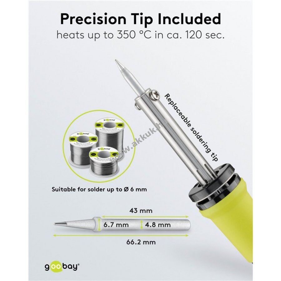 Cserélhető forrasztóhegy alkalmas legfeljebb 6 mm átmérőjű forrasztóónhoz