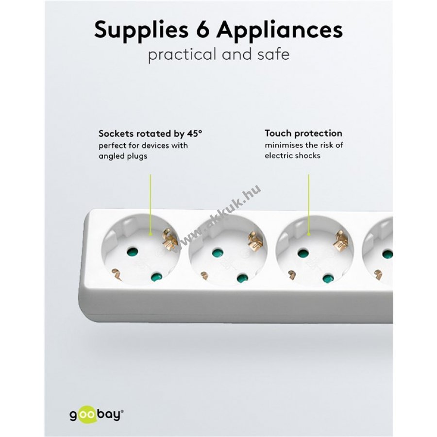 Többcsatlakozós hosszabbító érintésvédelemmel 6 csatlakozóval és ferdén elhelyezett védőérintkezős dugóval 45 fokban elforgatott aljzatokkal Ez a típus kizárólag beltéri használatra alkalmas