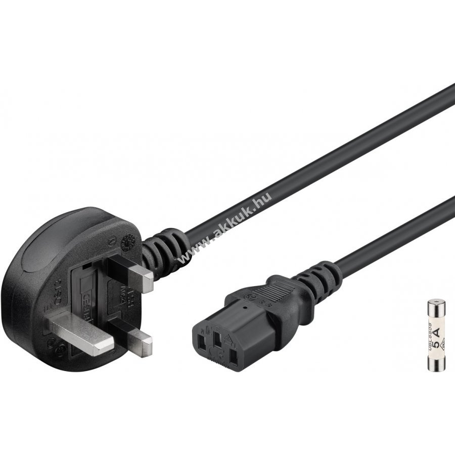 3 pólusú hálózati kábel C13 csatlakozóval IT eszközök és háztartási gépek számára 5 A terhelhetőségig 90°-ban elfordított UK 3 tűs dugóval kíméli a helyet rugalmas PVC vezeték közepes mechanikai igénybevételre cserélhető 5 A biztosítékkal alkalmas PC monitor projektor UPS hálózati eszközök és nagy nyomtatók csatlakoztatására UK Írország Málta Szingapúr Egyesült Arab Emírségek és a legtöbb Nemzetközösségi ország szabványos csatlakozója