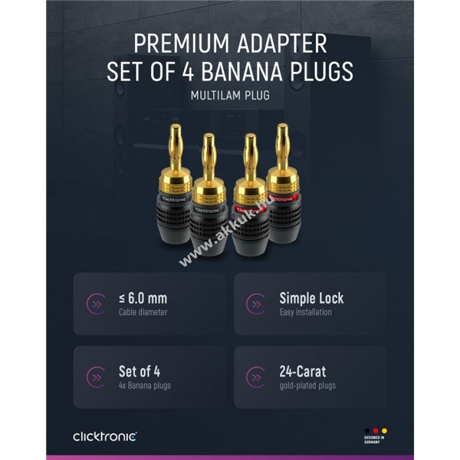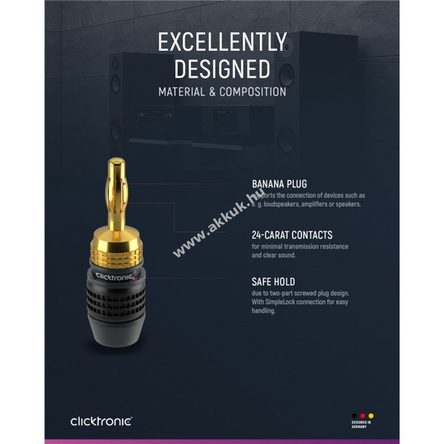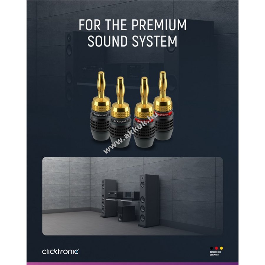 A Clicktronic prémium minőségű banáncsatlakozó adaptere 10 év garanciával biztosít hosszú élettartamot és stabil kapcsolatot. Teljes fém kivitelű műanyag borítással a pontos hangátvitelért és kiváló audioteljesítményért. Színes jelölésekkel gyors és helyes csatlakoztatás. Két részből álló, csavaros kialakítás biztonságos vezetékcsatlakozást garantál akár 6,0 mm2 keresztmetszetű hangsugárzó kábelekhez. 24 karátos aranyozott, rozsdamentes érintkezők ideális digitális és analóg sztereó jelátvitelt biztosítanak. A robusztus lamellás szerkezet tartós otthoni szórakozást nyújt.