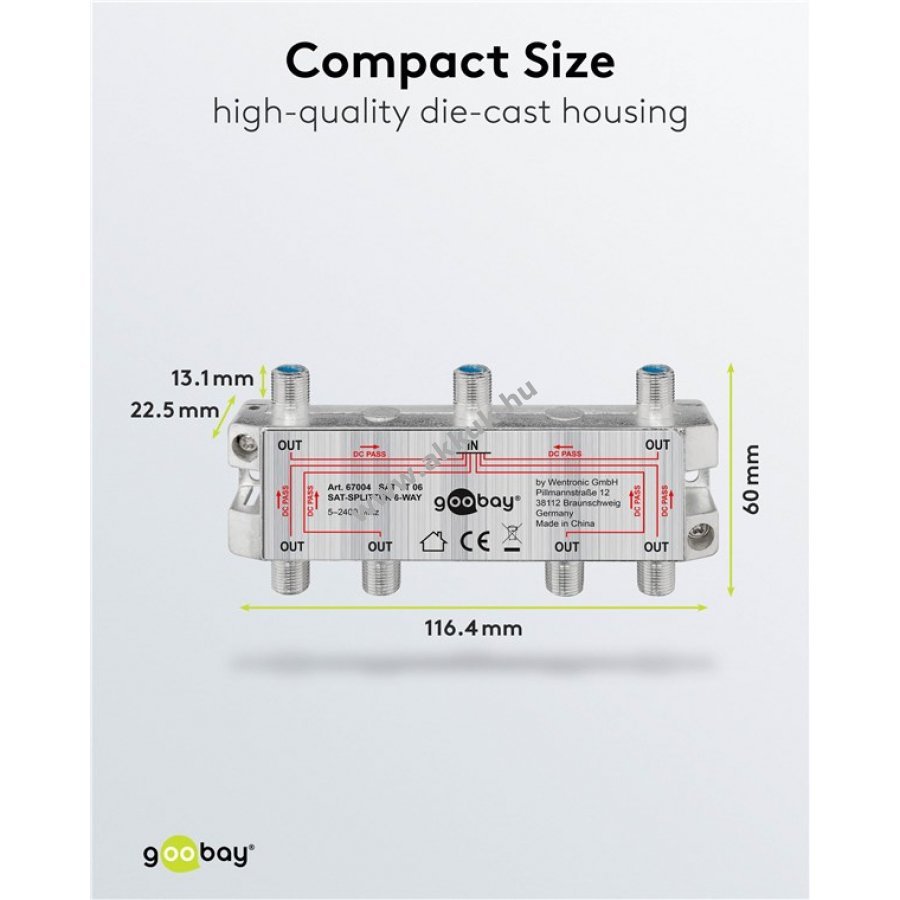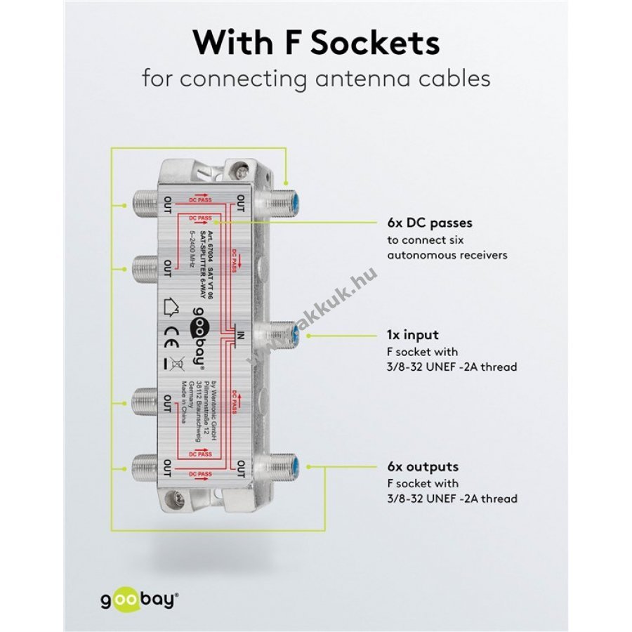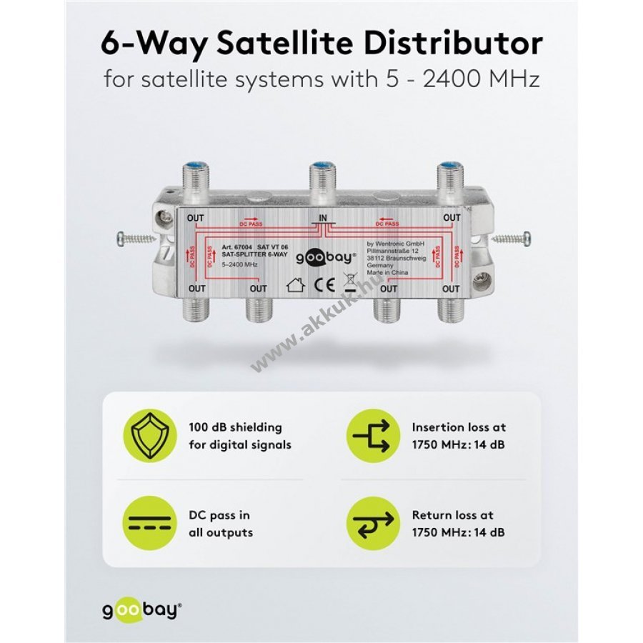 A SAT elosztó egy műholdas jelet oszt szét 6 kimenetre fém F-csatlakozókkal antennakábelekhez. 100 dB árnyékolással védi a digitális jeleket. Minden csatlakozó DC átvitellel és diódás leválasztással rendelkezik. 1750 MHz-en 14 dB az elosztási és a visszaverődési csillapítás.