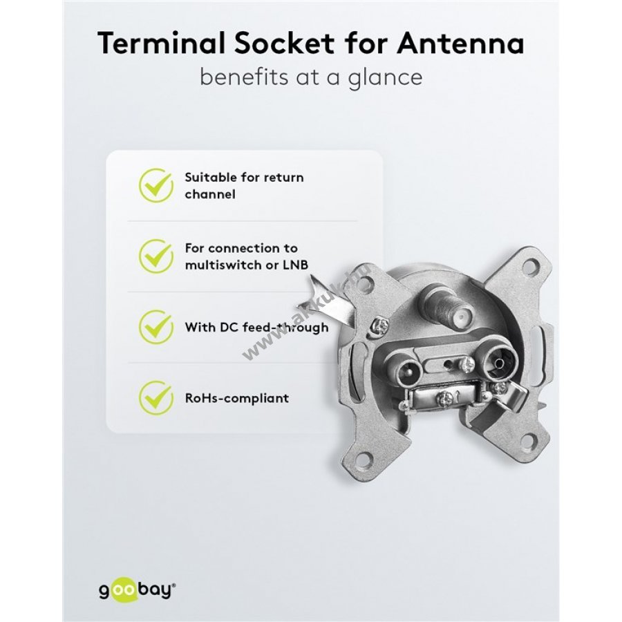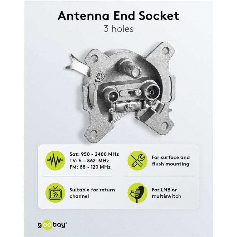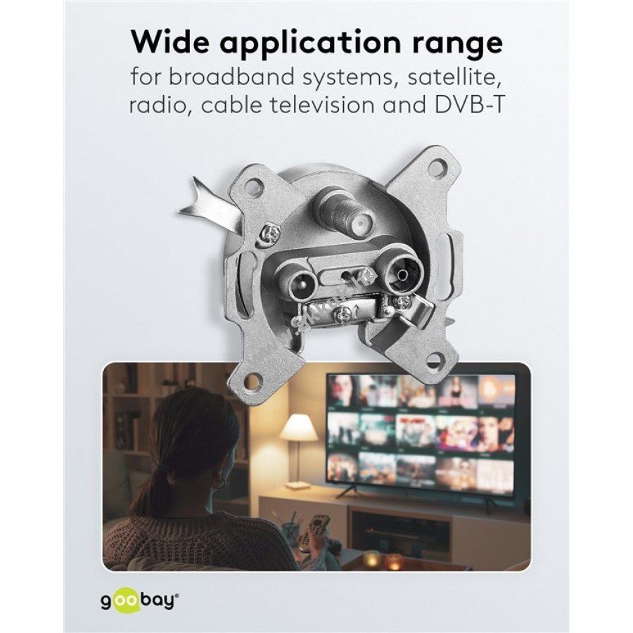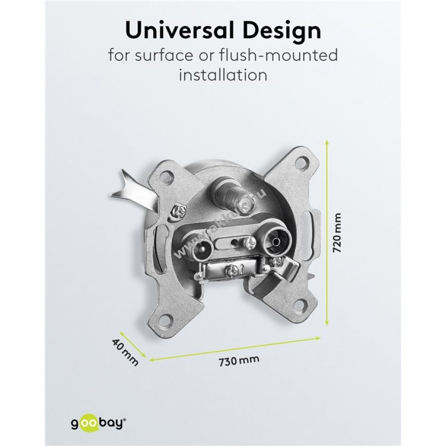 Antennacsatlakozó BK rendszerekhez rádióhoz SAT-hoz kábeltévéhez és DVB-T-hez Sat aljzat visszirány támogatással. Antennacsatlakozó multikapcsolóhoz vagy LNB-hez. Felületre és falba szerelhető. Működési frekvencia 950 MHz-től 2400 MHz-ig SAT esetén 88 MHz-től 120 MHz-ig rádió esetén. Hullámellenállás 75 Ohm.