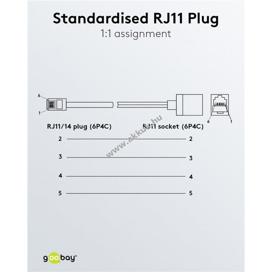 - szabványos RJ11 csatlakozók 1:1 bekötéssel (6P4C)