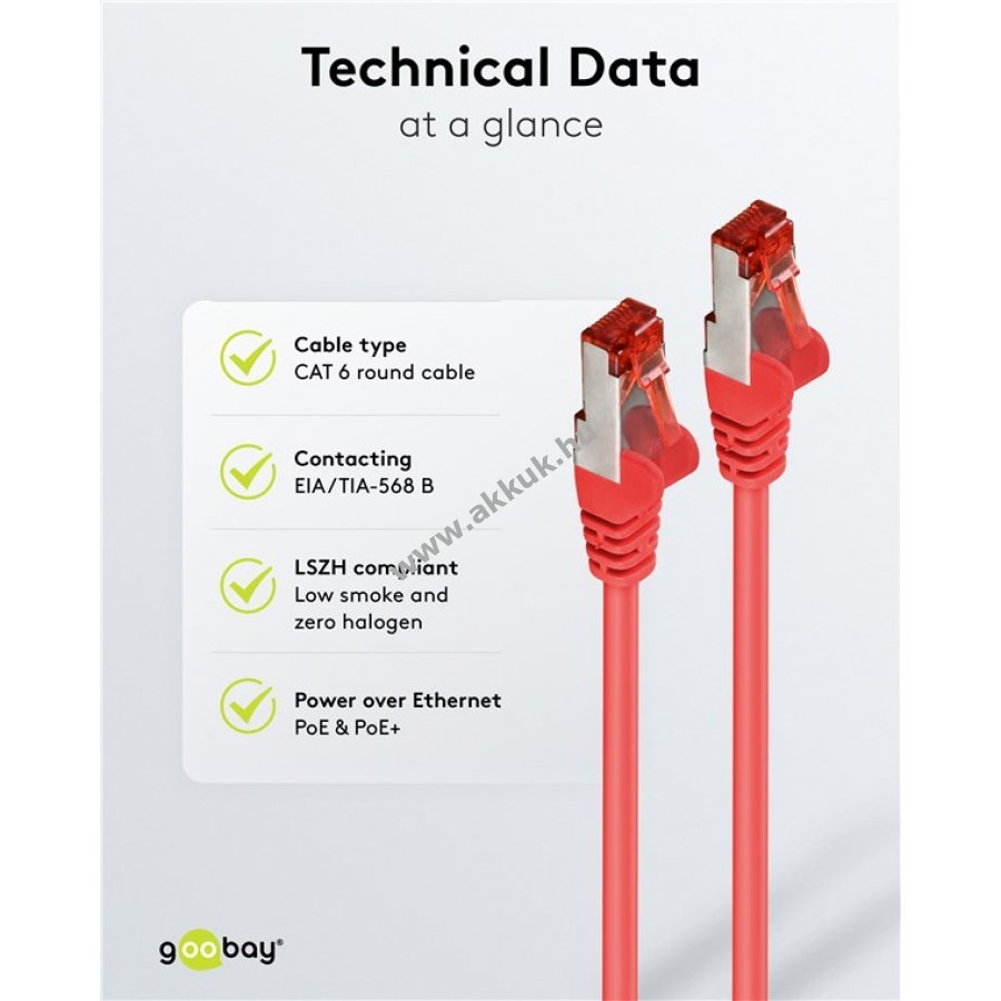 A Goobay CAT 6 patchkábel kiváló jelátvitelt biztosít nagy sebességnél stabil hálózati kapcsolat mellett. Dupla árnyékolású S/FTP kialakítású, amely alumínium fólia az egyes érpárok körül (PiMF) és alumínium fonat a kábelburkolaton. Kiváló minőségű rézvezető és aranyozott érintkezők garantálják a megbízható teljesítményt. A kábel törés elleni védelme és a megerősített burkolat hosszú élettartamot biztosít. Az RJ45 csatlakozó reteszvédelme megakadályozza a véletlen leválást. A kábel CAT-6 szabvány szerint tesztelt és támogatja a Power over Ethernet (PoE, PoE+) funkciót.