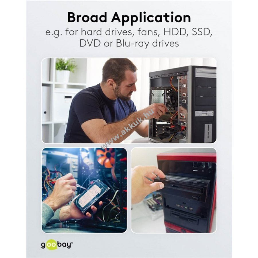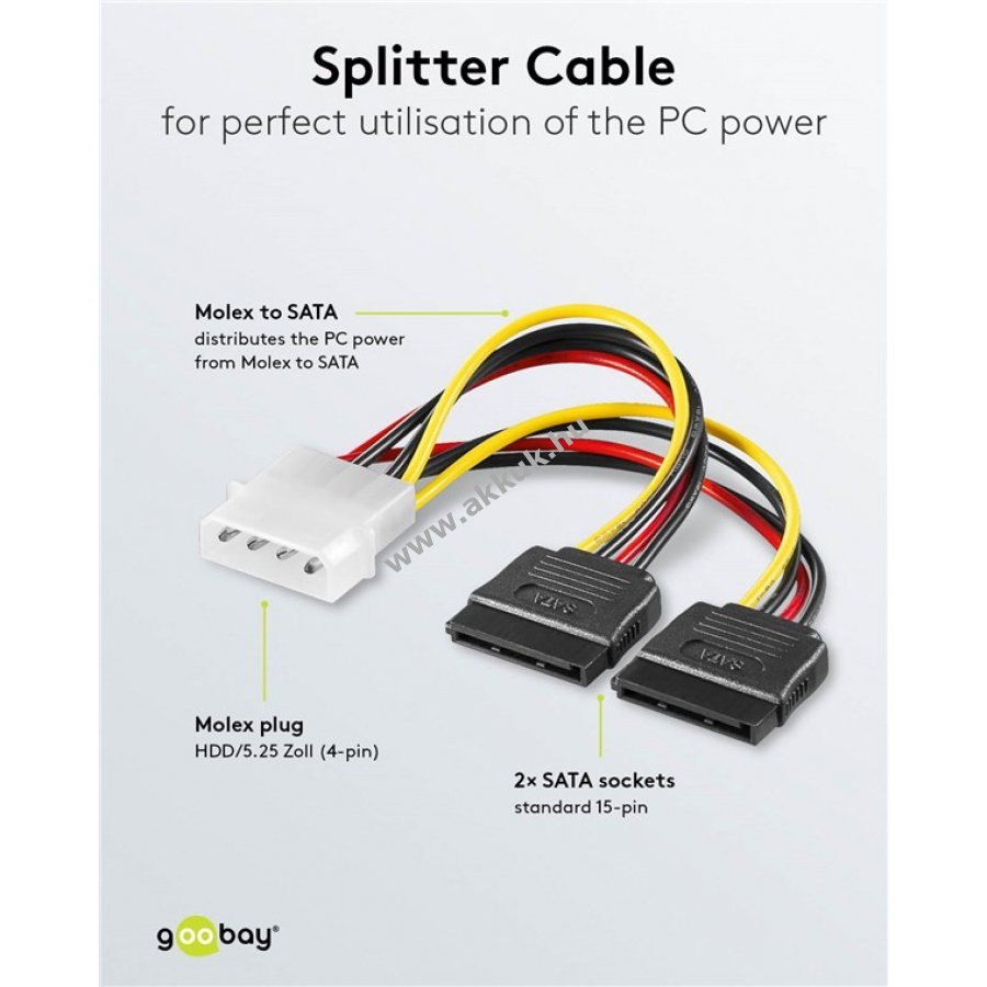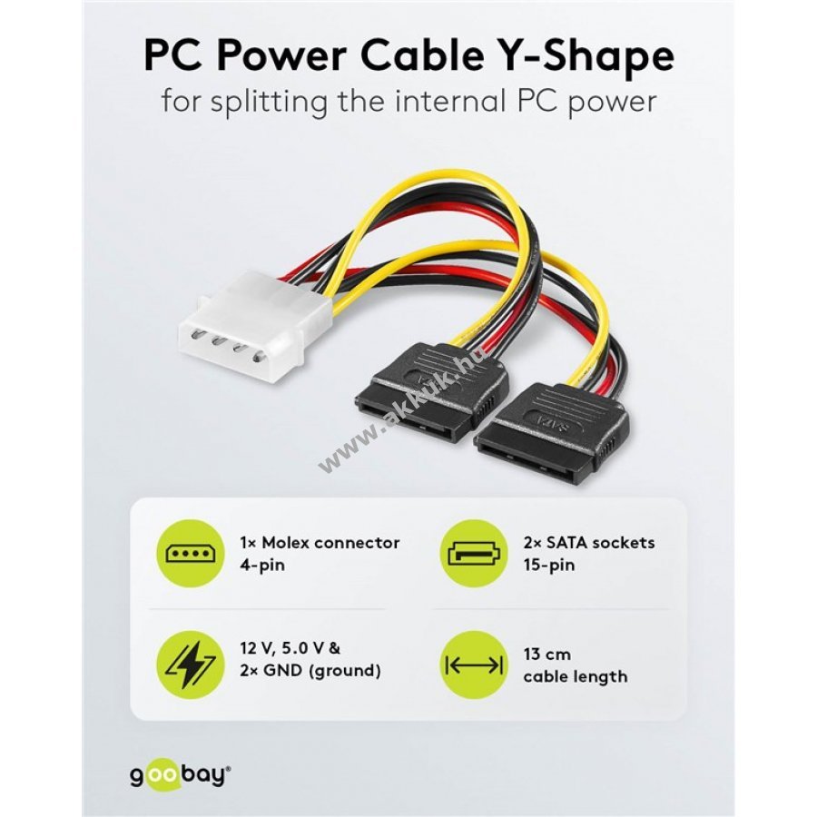 SATA tápkábel belső PC tápellátás elosztására 1x Molex 4 tűs csatlakozóról 2x SATA tápcsatlakozóra. Alkalmas merevlemezhez, ventilátorhoz, HDD, SSD, DVD vagy Blu-ray meghajtóhoz. A tápellátás a hagyományos Molex csatlakozóról áramlik a perifériák felé, például Serial ATA merevlemezekhez és optikai meghajtókhoz. A 0,13 m hosszúságú kábel rövid, így rendezett megjelenést biztosít a számítógépházban kábelrengeteg nélkül. Csatlakozók: 1x Molex 4 tűs dugó, 2x SATA 15 tűs aljzat. Négy áramvezeték: sárga 12 V, 2x fekete GND (föld), piros 5 V. Nem alkalmas adatátvitelre SATA csatlakozón keresztül.