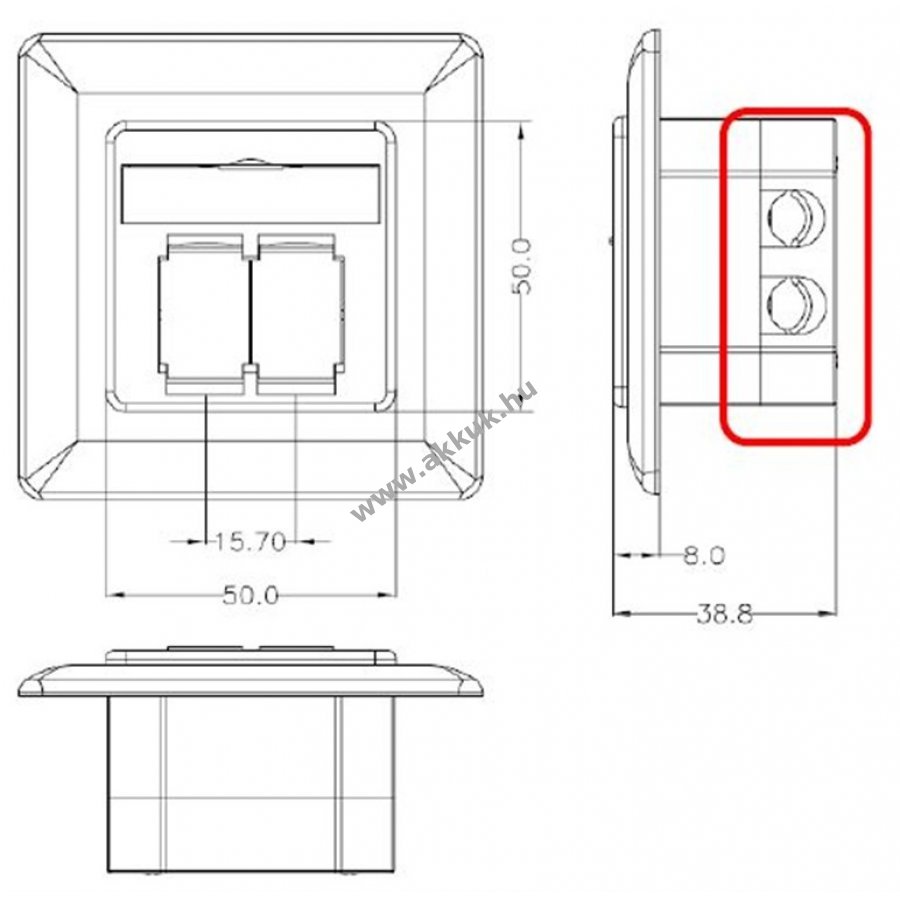 Árnyékolt adatcsatlakozó porvédő ajtókkal 2x RJ45 LAN kábel csatlakoztatásához.