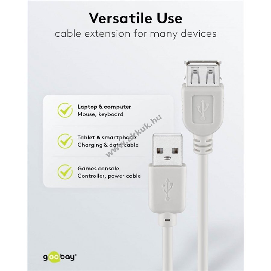 USB 2.0 szabványú kábel USB-A csatlakozóval eszközök szinkronizálásához és töltéséhez. Hi-Speed adatátvitel akár 480 Mbit/s sebességgel. Kompatibilis USB-A csatlakozókkal. 0,3 m hosszúság és 2,5 W teljesítmény 0,5 A áramerősség mellett.