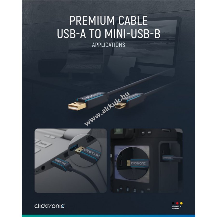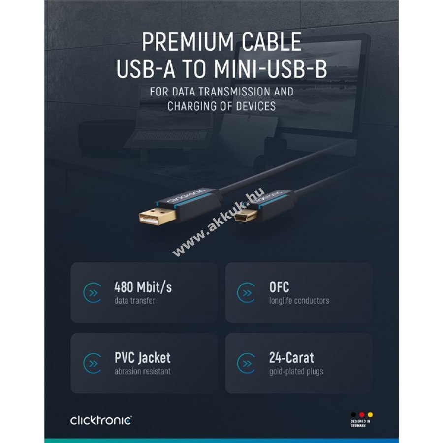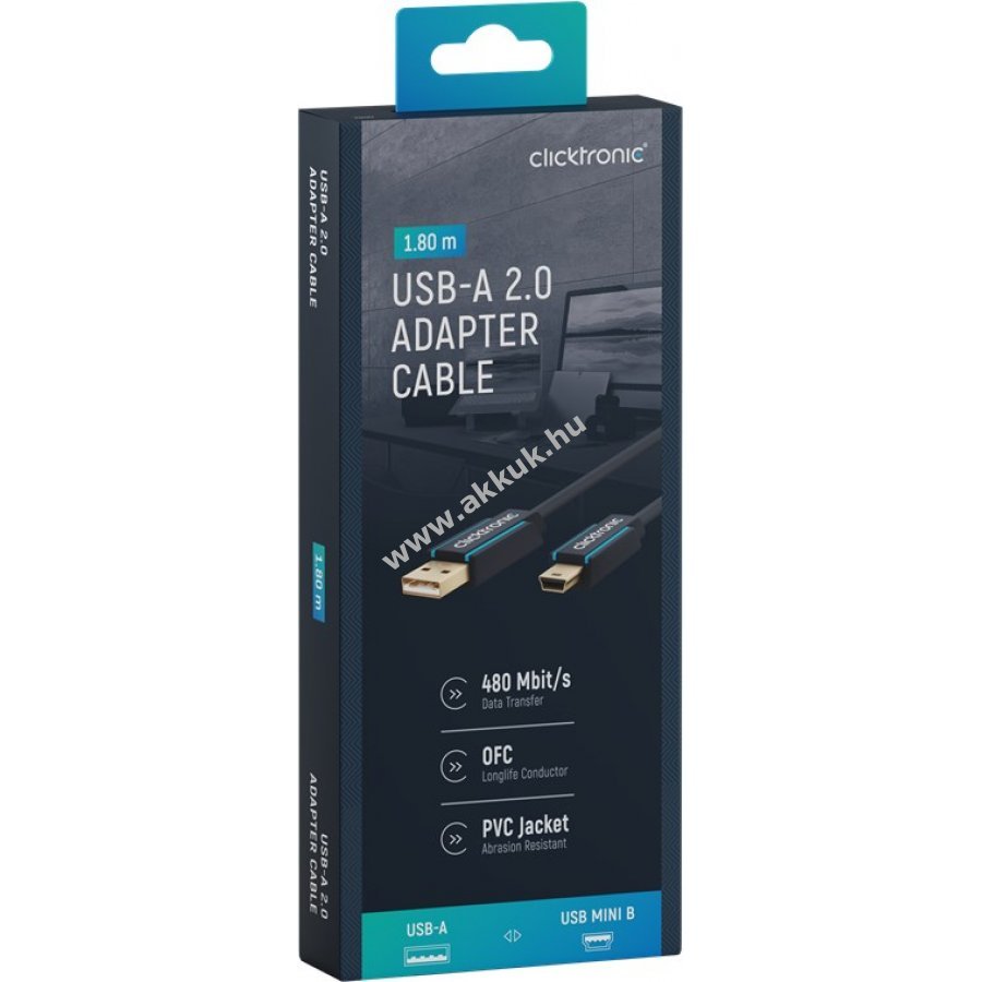 Clicktronic USB-kábel hosszú élettartamra és stabilitásra tervezve 10 év garanciával. A háromrészes csatlakozó PVC- és ABS-alkatrészekből áll, amely védi a kábelt a hirtelen húzástól és töréstől. 24 karátos aranyozott fém érintkezők és tiszta réz vezetők gyors adatátvitelt biztosítanak. Strapabíró PVC külső borítás tartós és stabil kapcsolatot garantál.