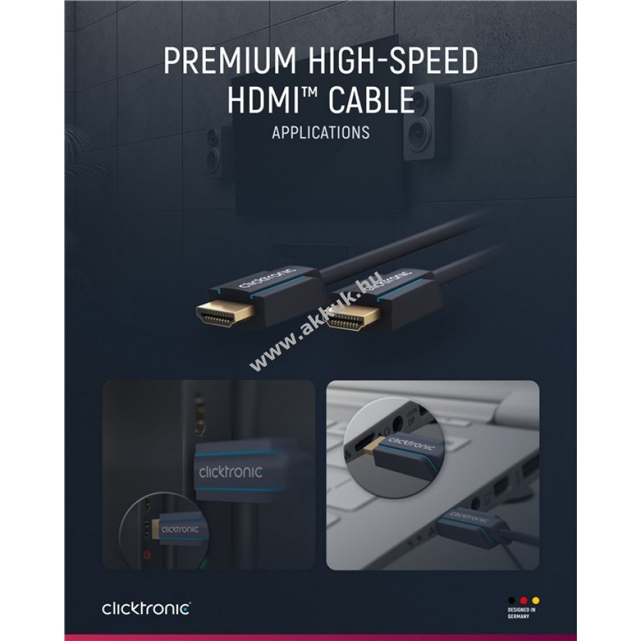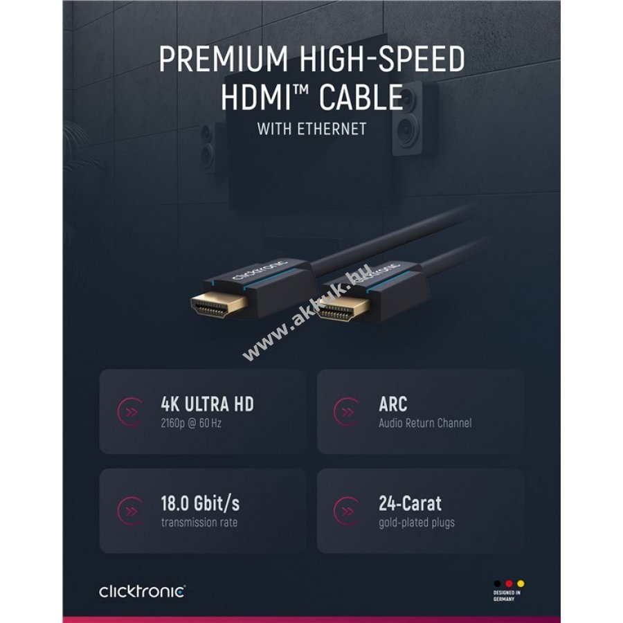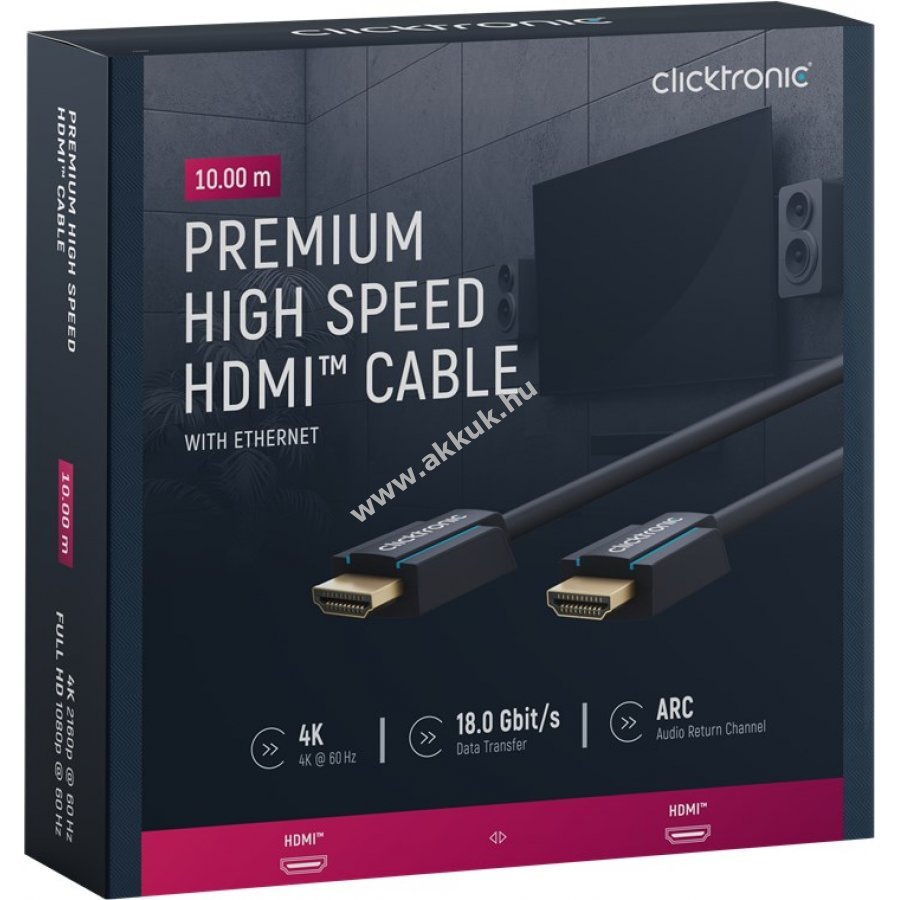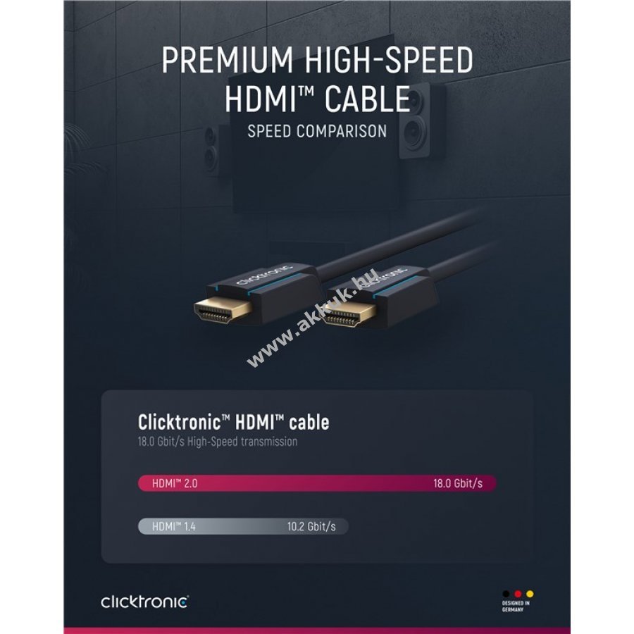 A Clicktronic HDMI High-Speed kábel kiváló tartósságot és stabilitást kínál 10 év garanciával. Különleges háromrészes PVC és ABS csatlakozó szerkezet csökkenti a kábel sérülését hirtelen húzás esetén. 24 karátos aranyozott csatlakozók és tiszta réz vezetők biztosítják a kiváló hang- és képátvitelt tökéletes otthoni mozi és játékélményhez.