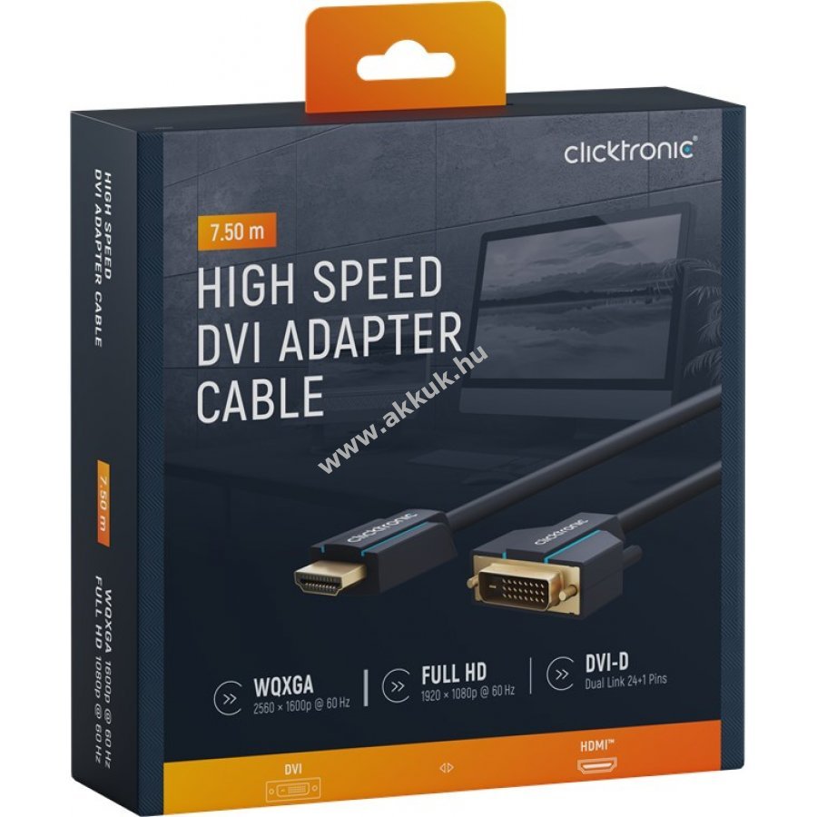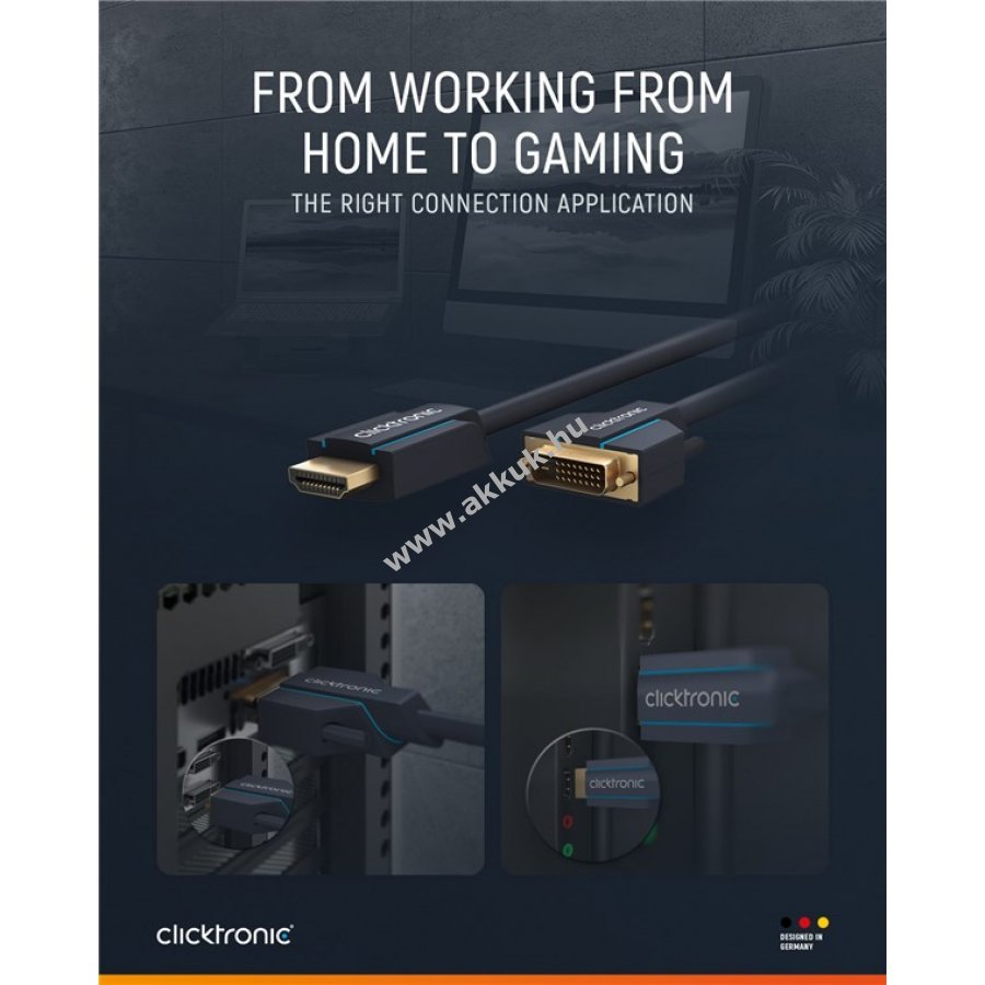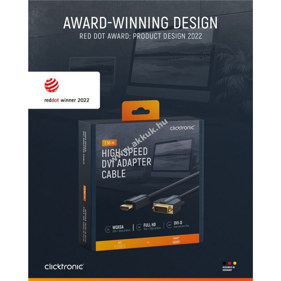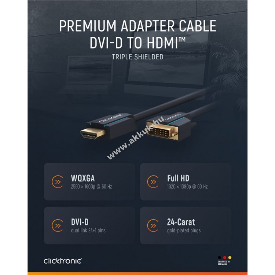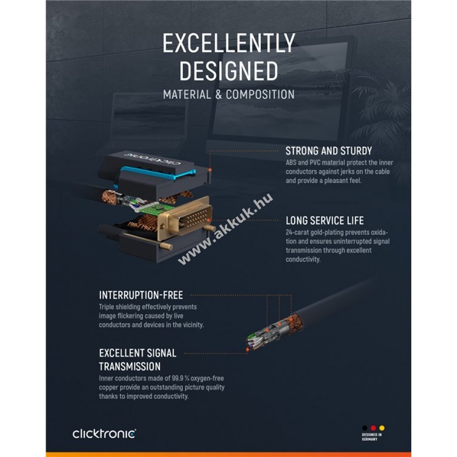 A Clicktronic kábel tartósságra és stabilitásra készült 10 év garanciával. A háromrészes PVC és ABS csatlakozóvédelem megakadályozza a kábel törését hirtelen húzás esetén. A 24 karátos aranyozott csatlakozók és tiszta réz vezetők maximális digitális jelátvitelt biztosítanak. A csavaros rögzítés stabil tartást nyújt mozgó monitoroknál. Az adapter éles képet és gyors adatátvitelt tesz lehetővé.