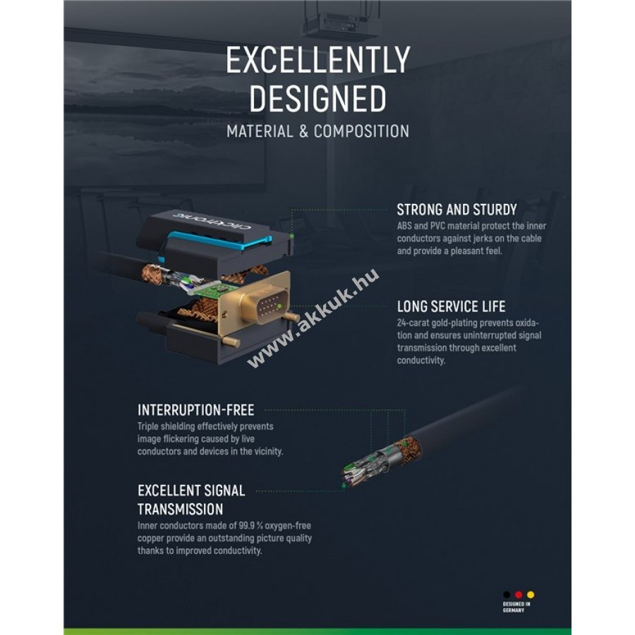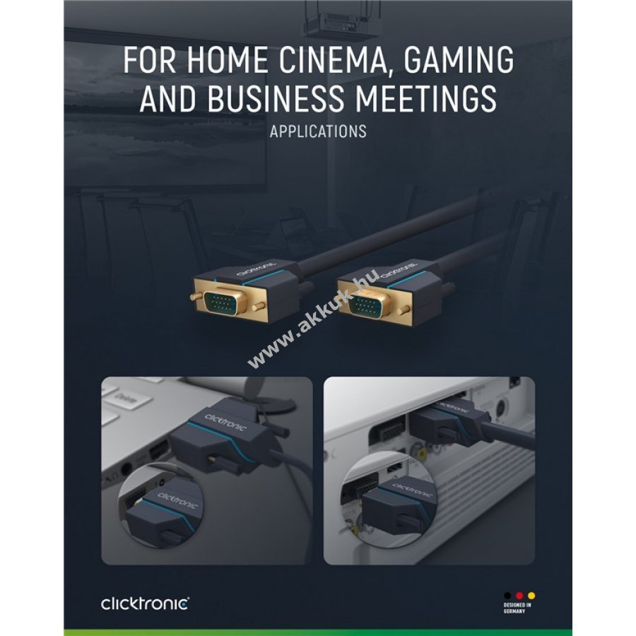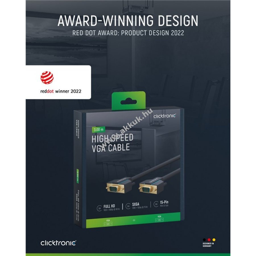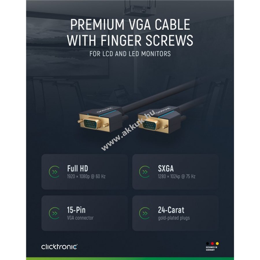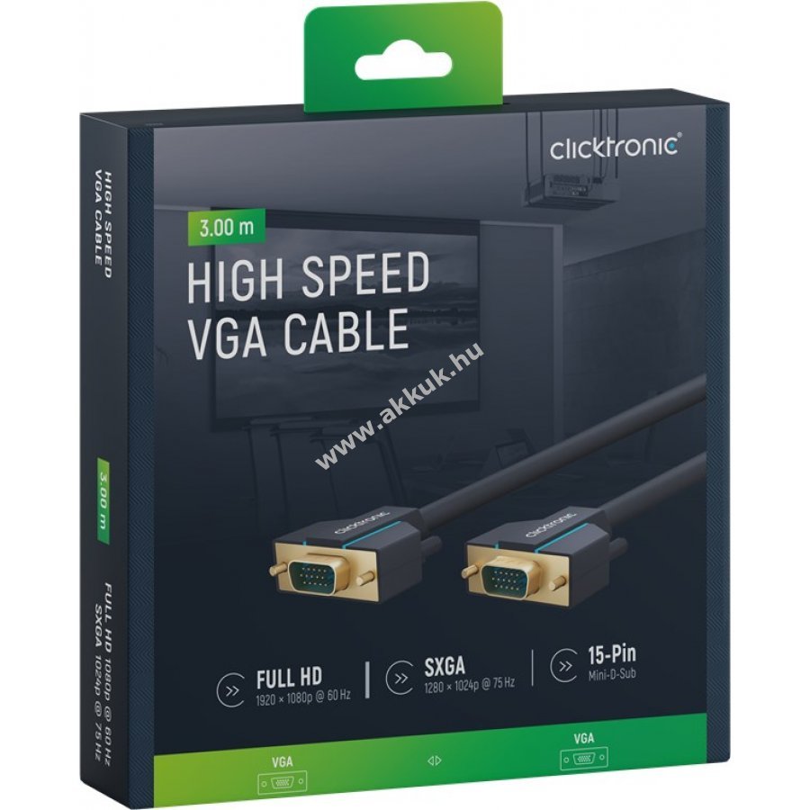 A Clicktronic VGA kábel tartósságra és stabilitásra készült 10 év garanciával. Különleges háromrészes PVC és ABS csatlakozóvédelem megakadályozza a kábel törését hirtelen húzás esetén. 24 karátos aranyozott érintkezők és tiszta réz vezetők biztosítják a kiváló minőségű videóátvitelt. A kábel analóg videójelet továbbít PC vagy laptop 15 tűs VGA csatlakozójáról monitorra, képernyőre vagy projektorra. Támogatja a legfeljebb SXGA felbontást 75 Hz frissítési frekvenciával. A csavaros rögzítés stabil kapcsolatot garantál még mozgatható kijelzőknél is. Kétszeres árnyékolás és rugalmas PVC köpeny könnyű hajlítást és elhelyezést tesz lehetővé.